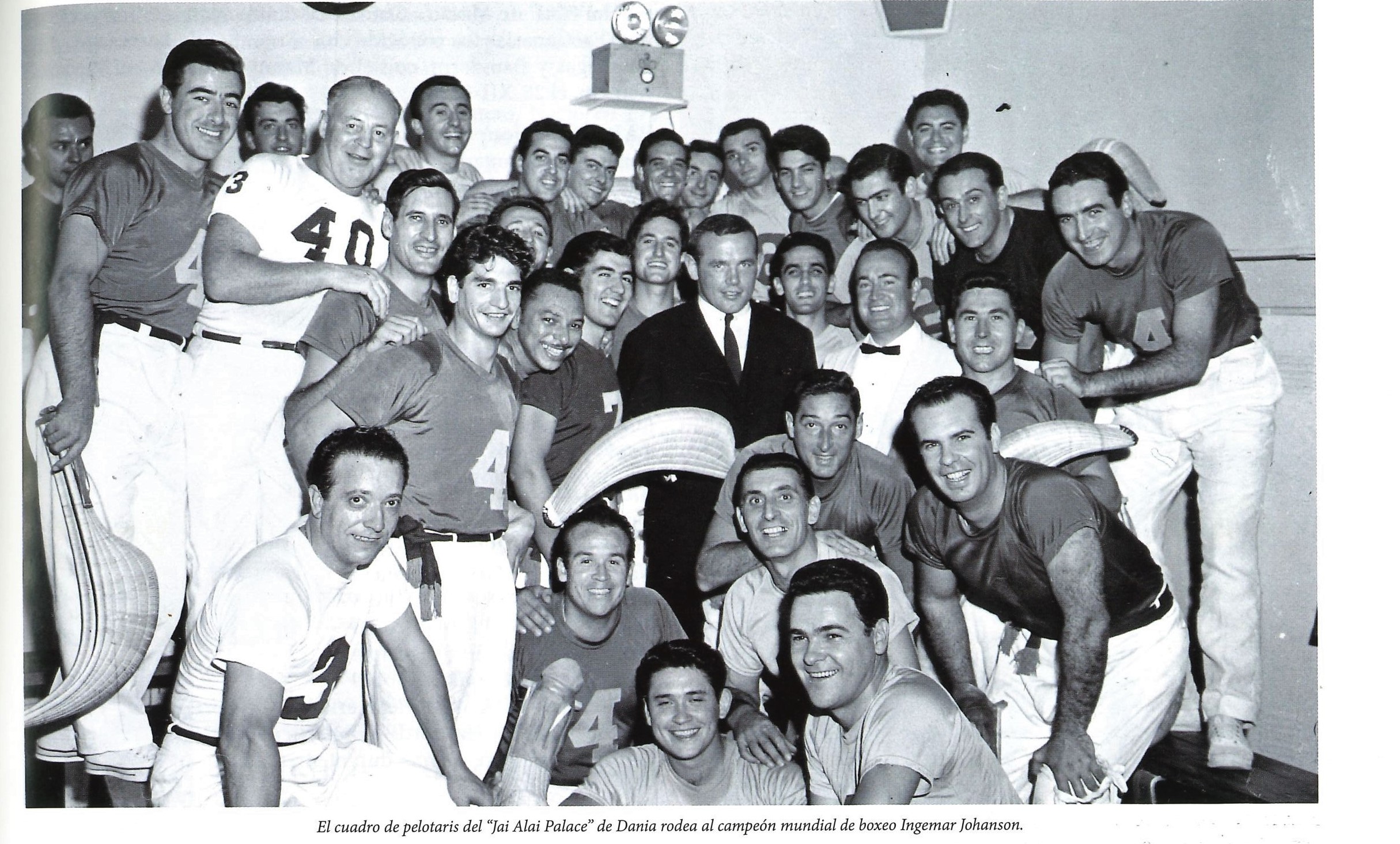 Cuadro de pelotaris en Jai Alai Palace, Dania, con el campeón mundial del boxeo Ingemar Johanson, entre otros pelotaris Alex Solozabal Areitio