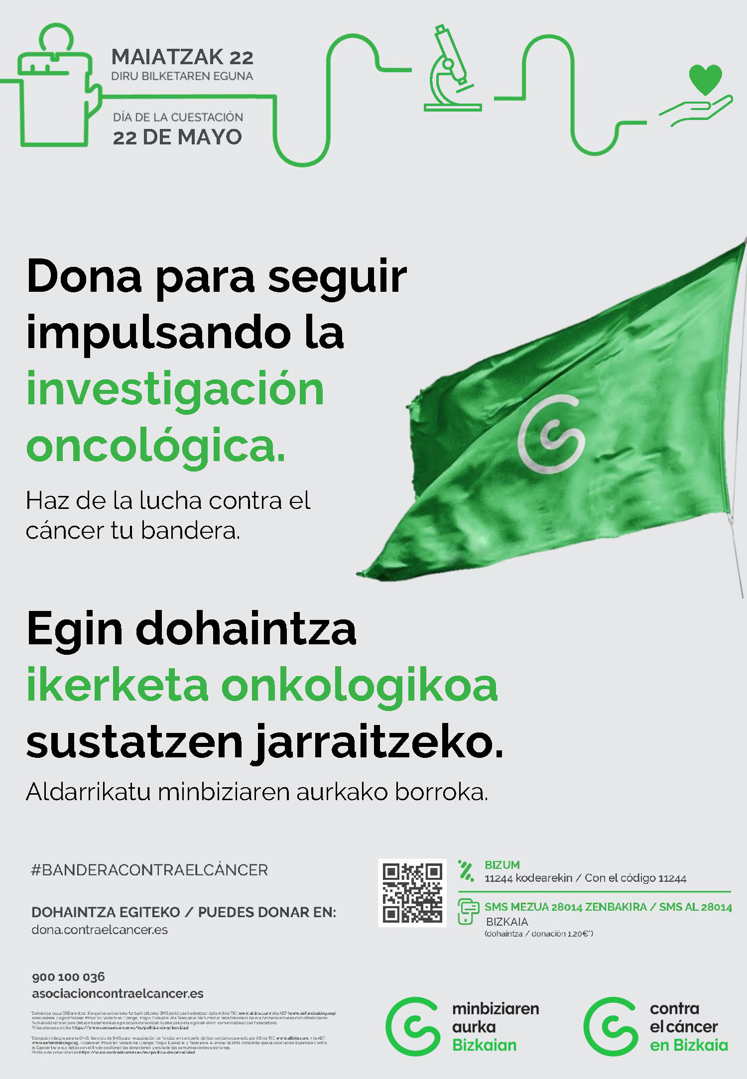 La Asociación contra el Cáncer en Bizkaia (ACB) celebrará este domingo, 22 de mayo, el Día de la Cuestación en Ermua. Los/as voluntarios/as de Ermua volverán a la calle en esta ocasión, bajo el lema “Haz de la lucha contra el cáncer tu bandera”. El grupo destacará en la calle la importancia de seguir impulsando la investigación oncológica. Tendrán una mesa informativa en la plaza Cardenal Orbe, en horario de 11.30 a 14.00 horas,