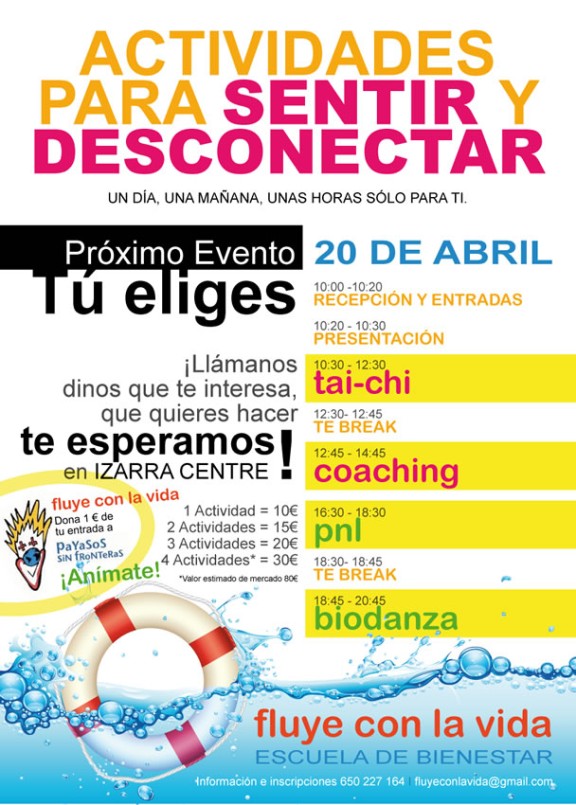 La localidad acoge esta semana una nueva jornada sobre ‘cómo gestionar las emociones y los sentimiento’. Su título es ‘Actividades para sentir y desconectar’. Tú eliges, un día, una mañana o sólo unas horas. Será este próximo sábado, 20 de abril, en horario de mañana y tarde en Izarra Centre. Las inscripciones están abiertas y para ampliar información podemos llamar al teléfono 650227164, en horario de 10:00 a 13:00 horas y de 17:00 a 19:00 horas. Así como en la cuenta de correo fluyeconlavida@gmail.com. /’Emozioak kudeatzen ikasteko’ jardunaldi berria egingo da gure herrian hirugarrenez. Apirilaren 20ko larunbatean izango da eta Izarra Centre eraikinean gauzatuko, goizeko eta arratsaldeko saioak izanik. Izen emateak hasita daude eta argibideetarako 650227164 telefonora dei dezakegu goizeko 10etatik ordu 1era eta arratsaldeko 5etatik zazpietara bitartean. Halaber, fluyeconlavida@gmail.com posta elektronikora ere idazterik badugu.