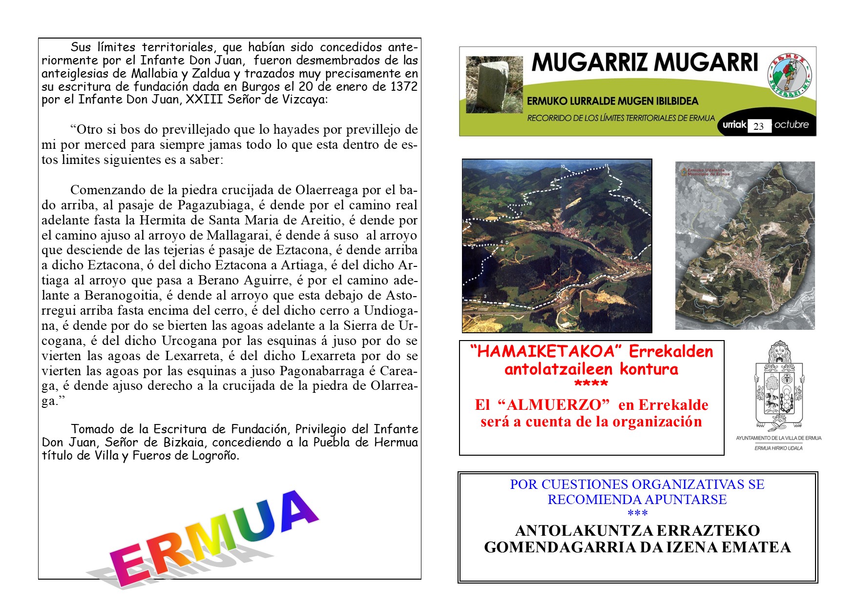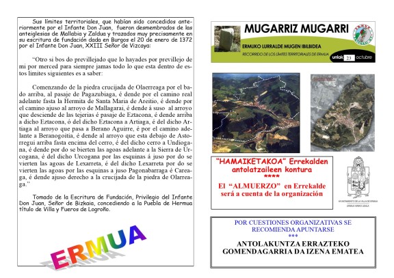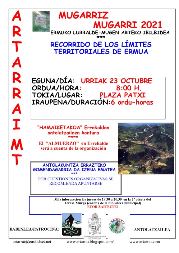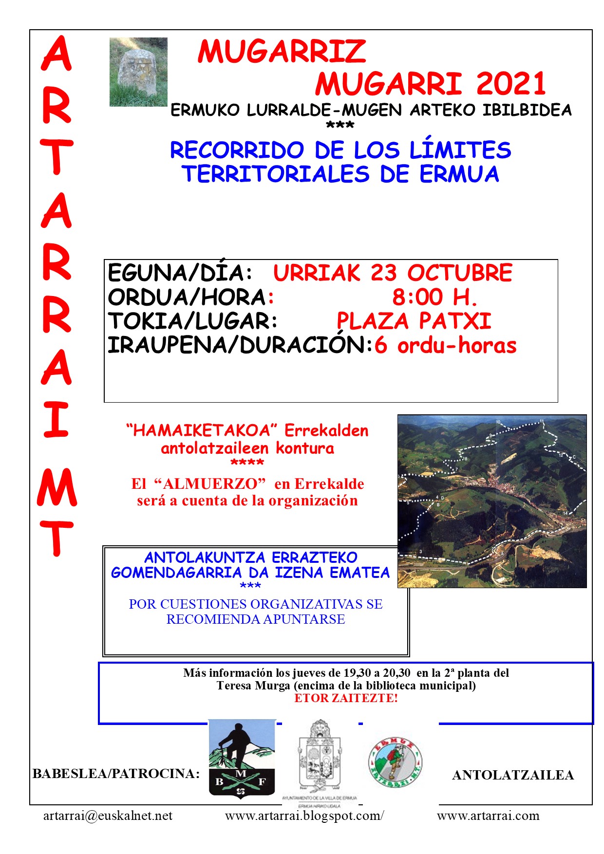 Con sus 6,49 kilómetros cuadrados, Ermua es un municipio pequeño hablando en términos territoriales, puesto que todos los pueblos que lo rodean son considerablemente más grandes. Aprovechando esta circunstancia, el club de montaña Artarrai ha organizado un año más la ruta Mugarriz Mugarri, que permite recorrer los límites de nuestra localidad en una sola mañana.