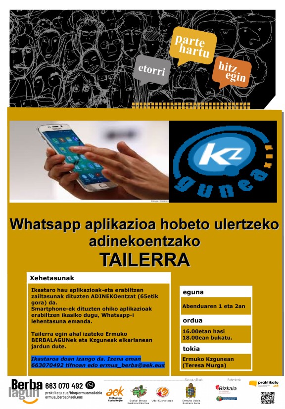 ‘Berbalagun' ekimenak bi jarduera iragarri ditu datozen bi asteetarako. Lehenengoa ‘Lagun pintxoa’ eta bigarrena; WhatsApp aplikazio ulertzeko tailerra. Parte hartzeko izena eman beharra dago aldez aurretik..