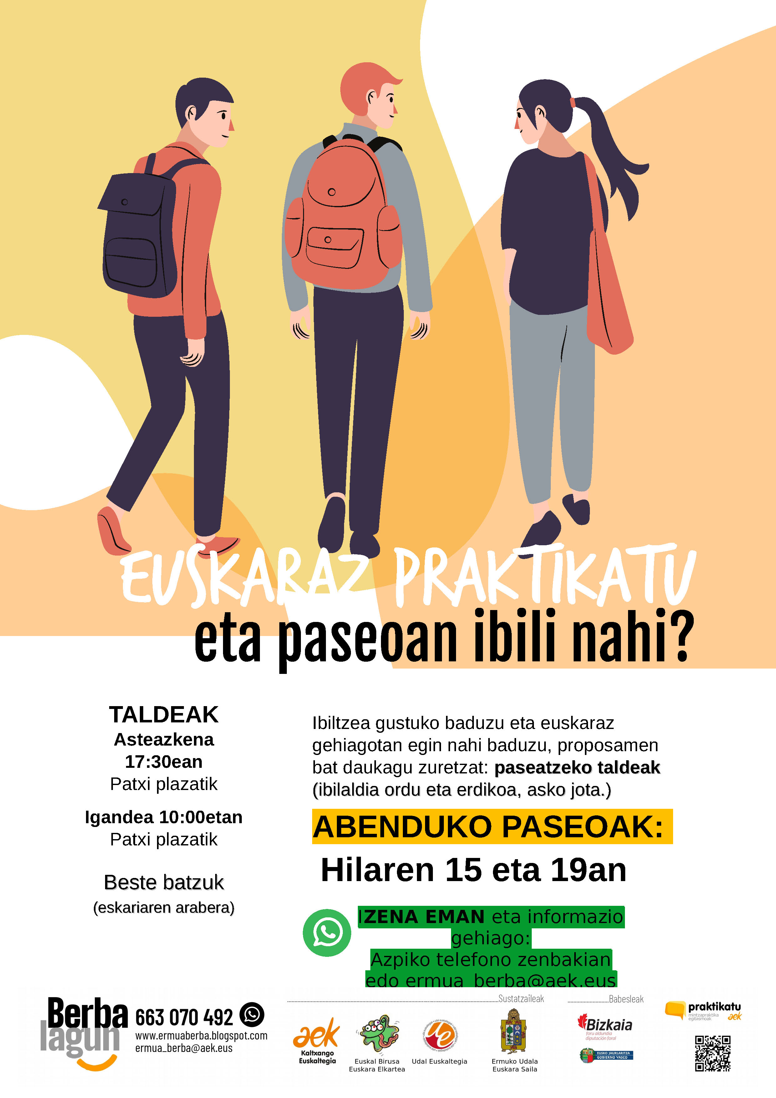 ‘Berbalagun' ekimenak bi jarduera antolatu ditu aste honetarako. Lehenengoa ‘Paseolagun’ da, asteazkeneko 17:30etan eta igande goizeko 10etan egingo direnak, hurrenez hurrez. Bigarrena. pintxolagun, ostegun aratsaldeako. Eman izena!