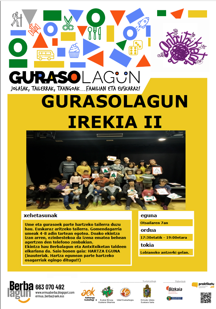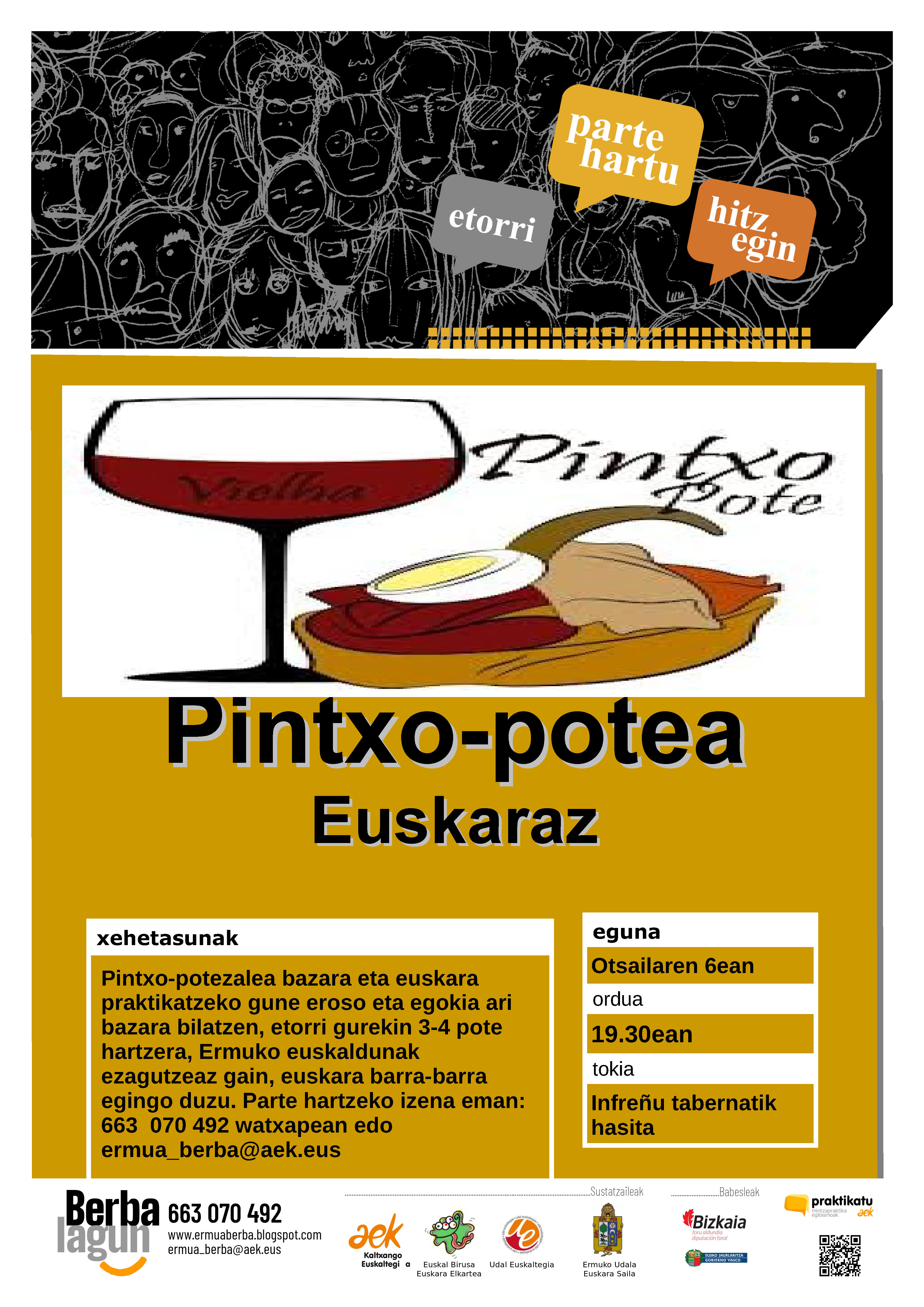 ‘Berbalagun’ ekimenak jarduera bi prestatu eta iragarri ditu aste honetarako. Lehena `pintxo-potea’ da eta ostegunean -6an- egingo. Bigarrena, doako tailerra ostiral arratsaldean -7an- egingo dena, Antxitxiketan taldearekin elkarlanean. Lehen proposamenean aukera eskaintzen dute euskara gune eroso eta egokian praktikatzeko. Parte-hartzaileek arratsaldeko zazpi eta erdietan elkartuko dira, Infreñu tabernan.