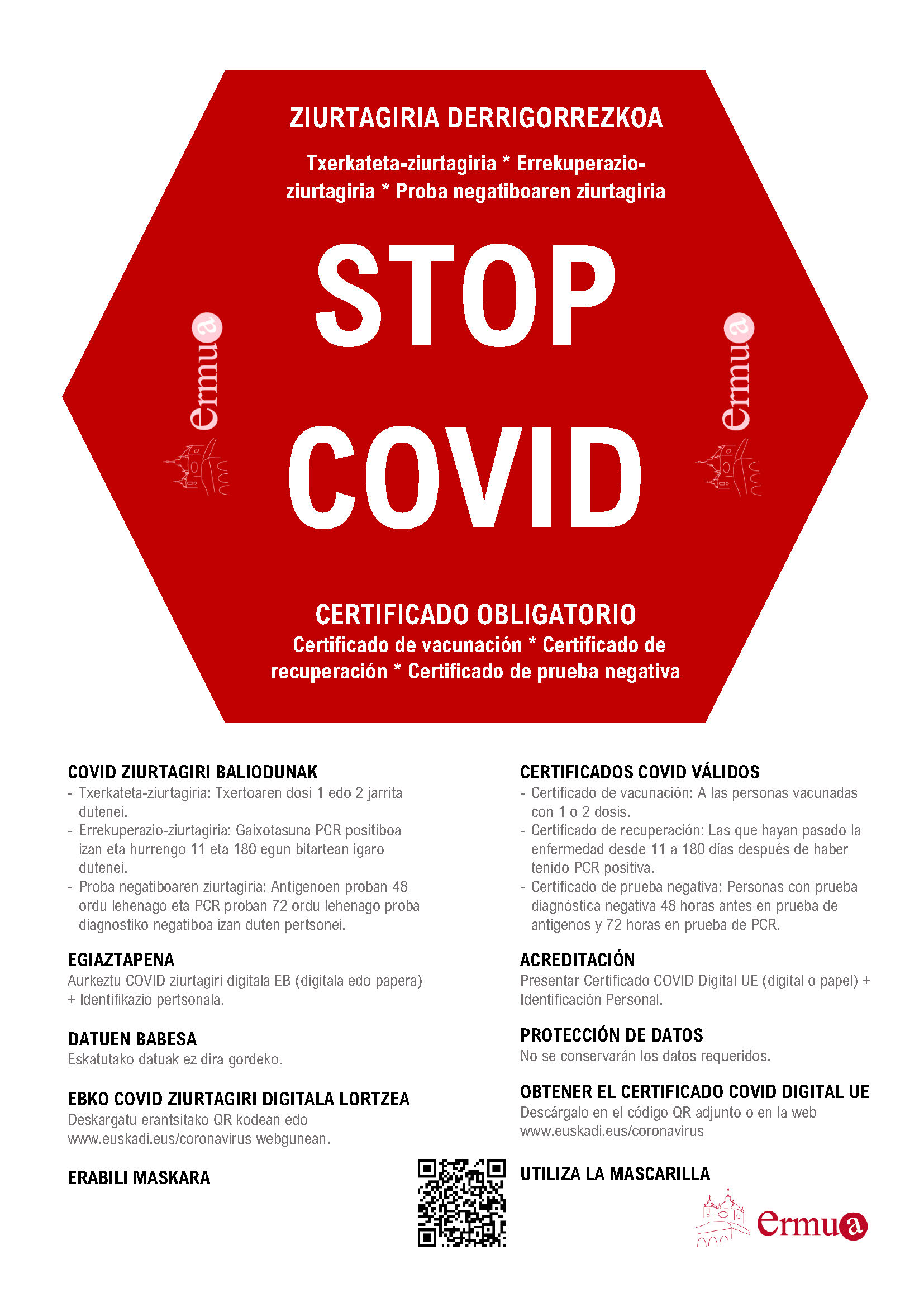 En cumplimiento del Decreto 47/2021, de 14 de diciembre, del Lehendakari, por el que amplía la obligatoriedad de presentar el certificado Covid a nuevos ámbitos, actividades y en localizaciones de espacios cerrados o de gran afluencia de personas, las instalaciones municipales de cultura y deportes ya lo exigen desde que entró en vigor en el día de ayer. Además, también es obligatorio acceder con mascarilla y llevarla puesta correctamente en todo momento.