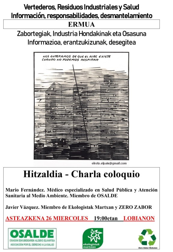 La Asociación por el Derecho a la Salud Osalde, Ekologistak Martxan y Zero Zabor Bizkaia han organizado una charla-coloquio en nuestro municipio para este miércoles 26 de febrero. El tema principal a tratar serán los vertederos, los residuos industriales y la salud: información, responsabilidades y desmantelamiento.