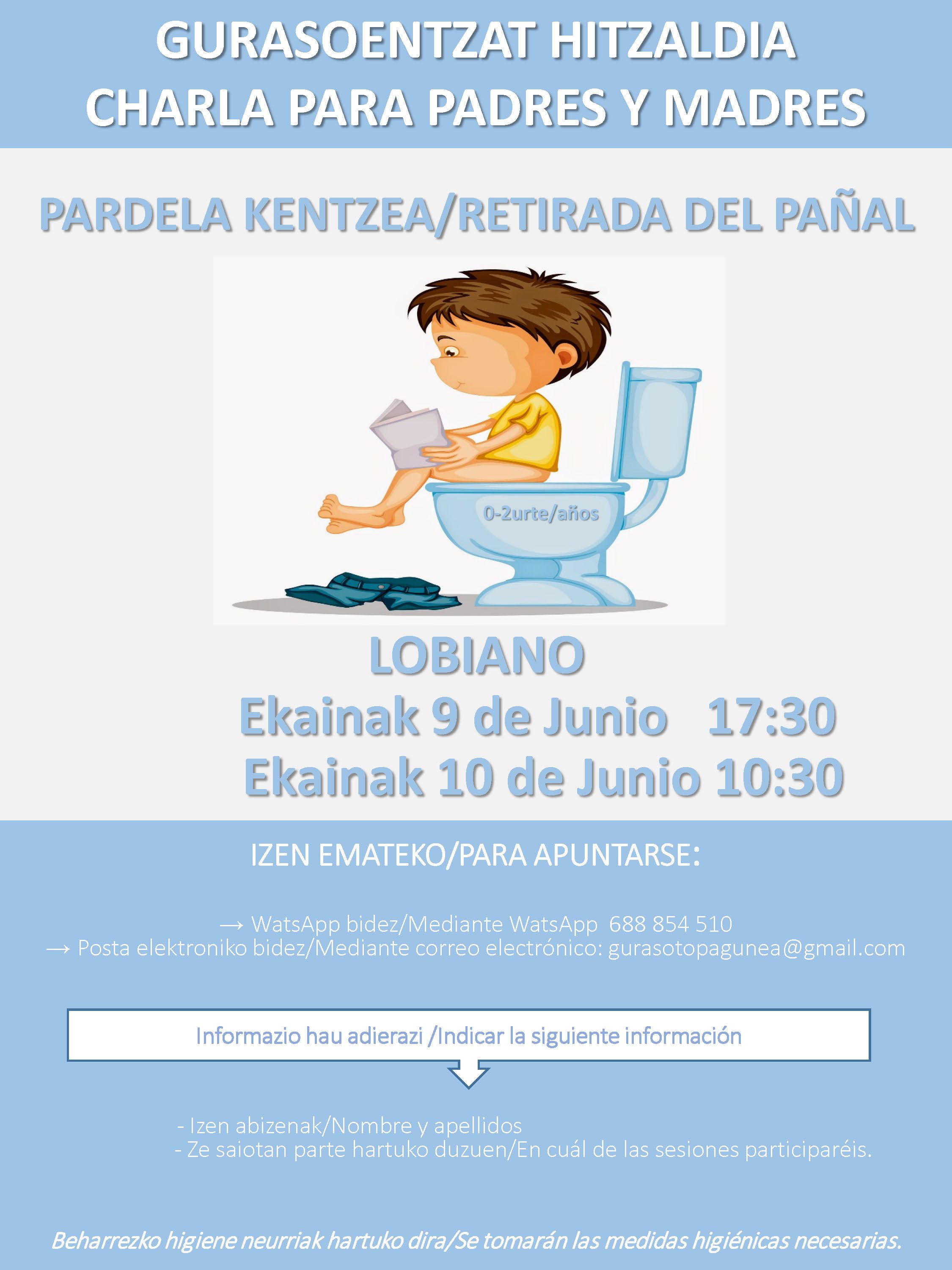 El Servicio de Intervención Socioeducativa y Psicosocial (SISP) del Ayuntamiento de Ermua ha organizado una nueva charla sobre el momento de retirar el pañal a los bebés. La sesión está dirigida a familias con hijos/as de entre 0 y 2 años, y tendrá lugar el próximo mes de junio en Lobiano Kultur Gunea.
