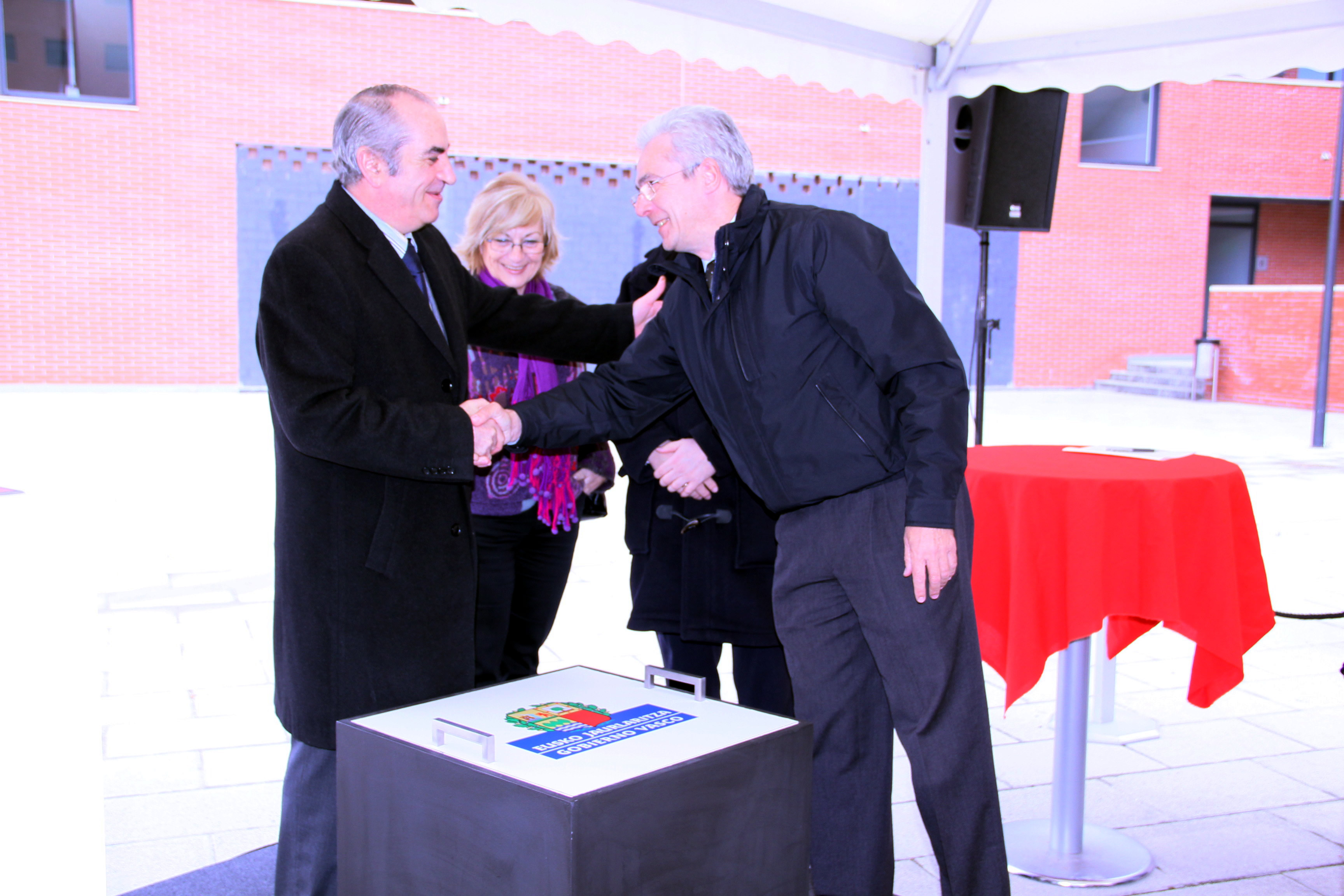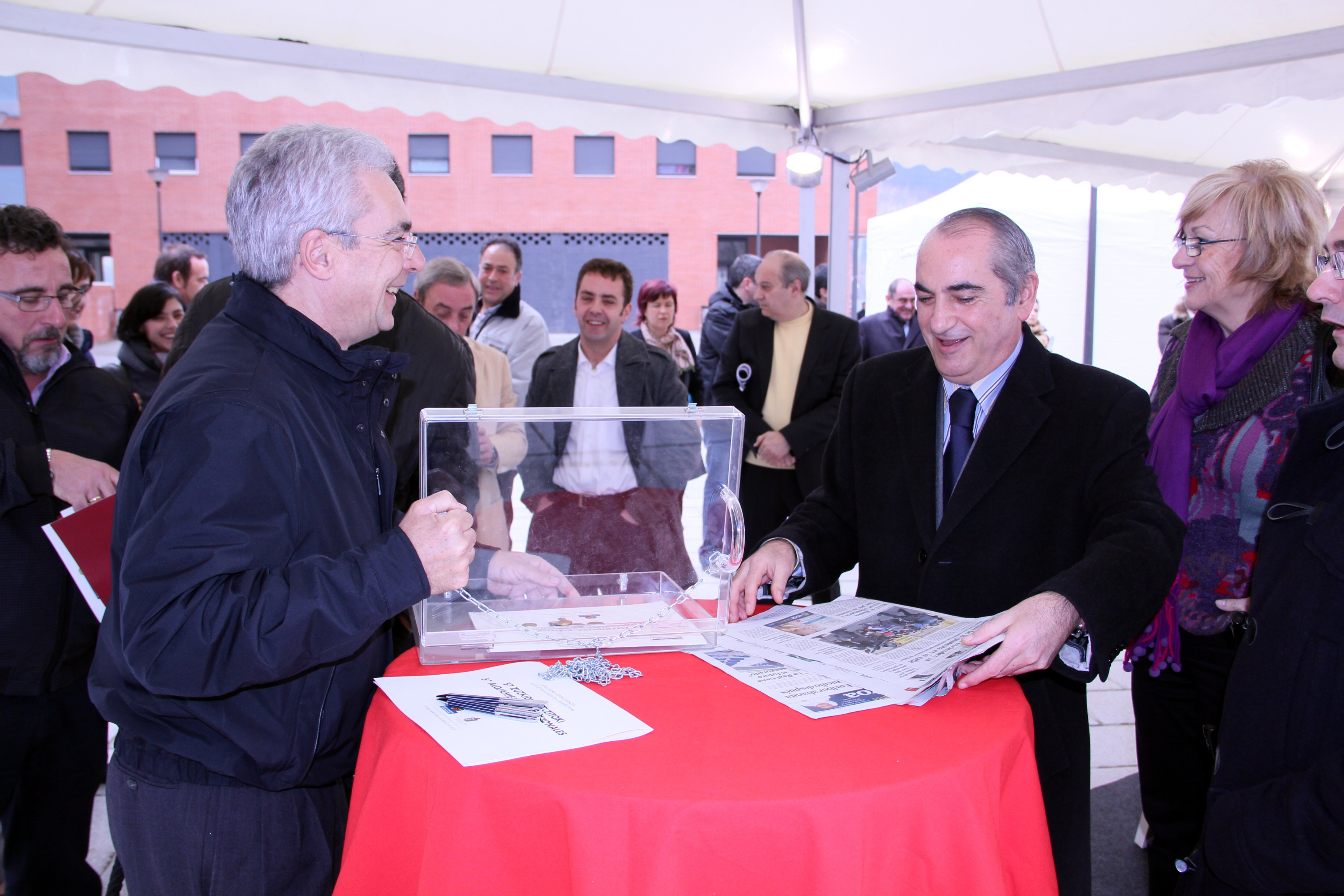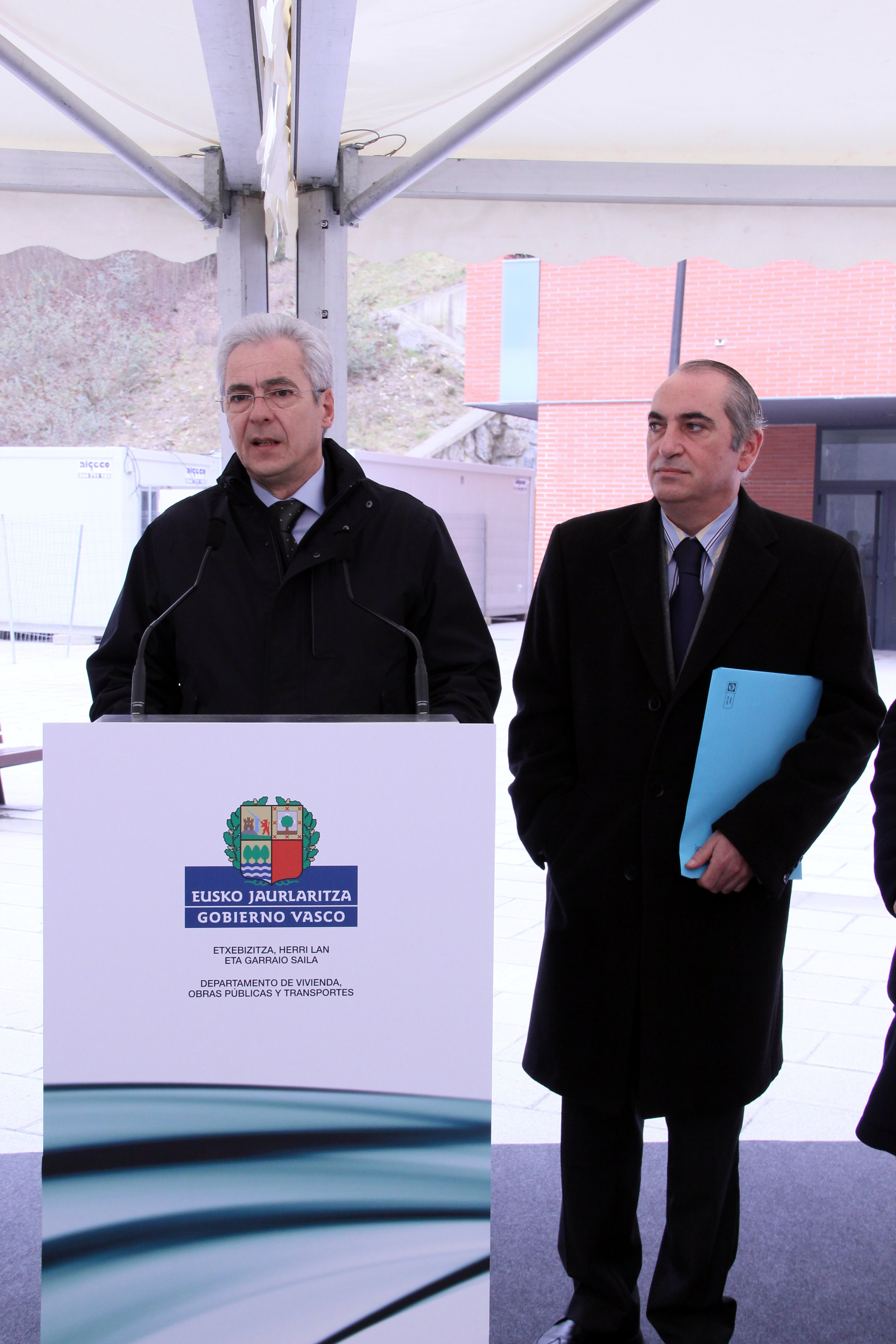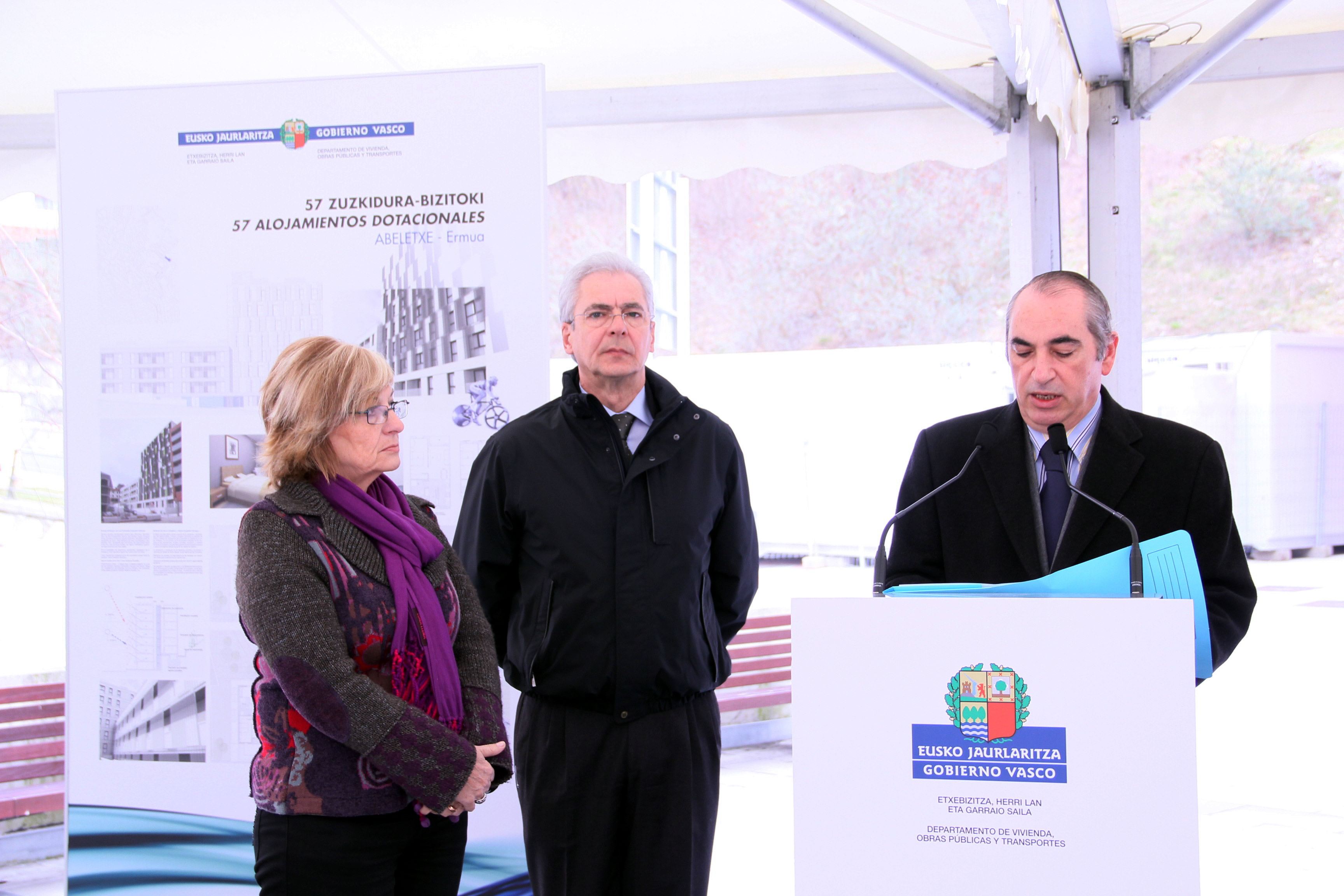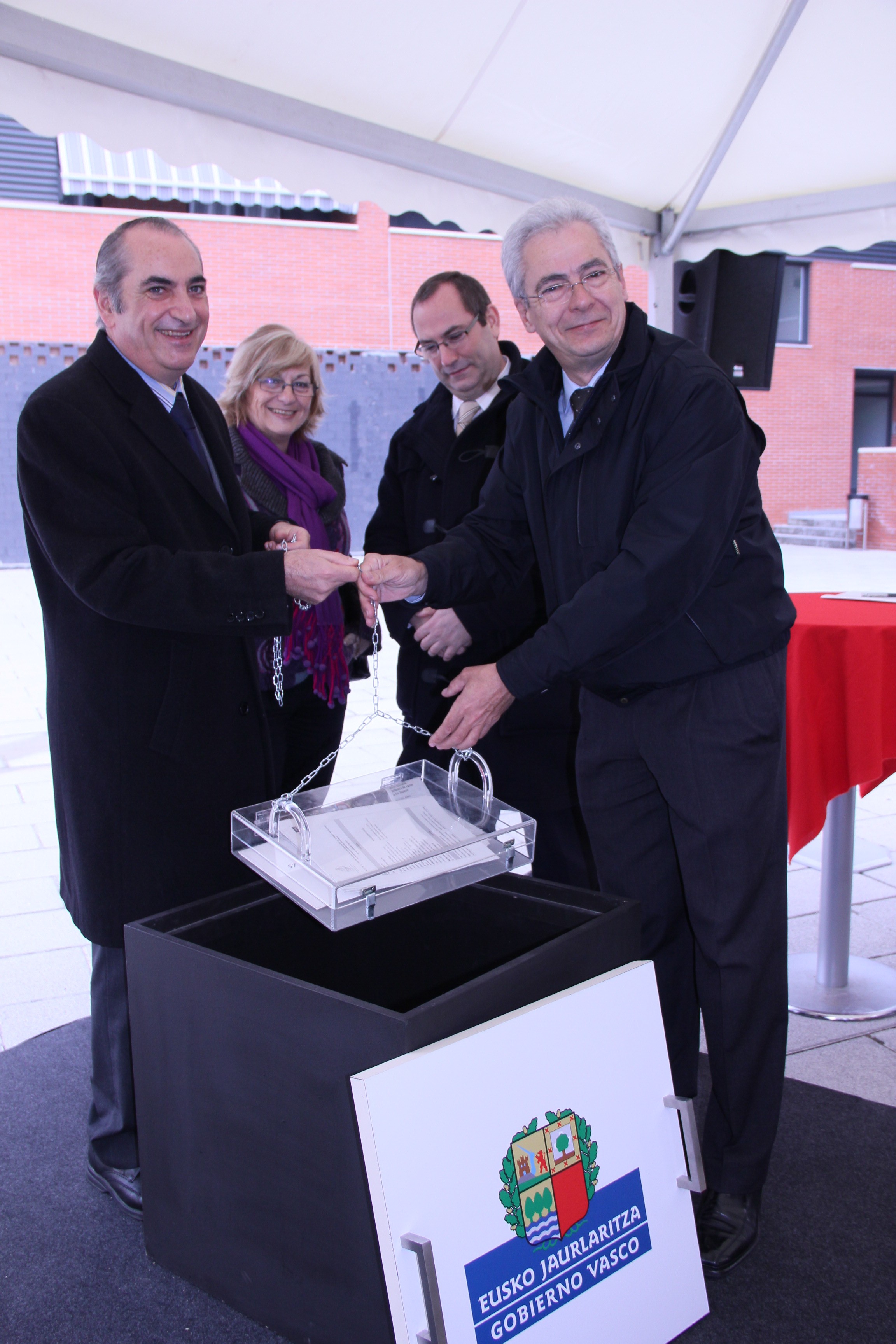 El Consejero de Vivienda Iñaki Arriola y el alcalde Carlos Totorika colocan la primera piedra de las obras para edificar 57 apartamentos dotacionales ,principalmente para personas jóvenes, en el sector Aneletxe de Ermua.