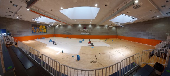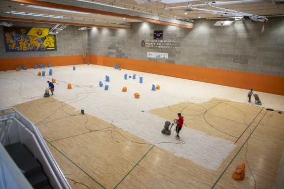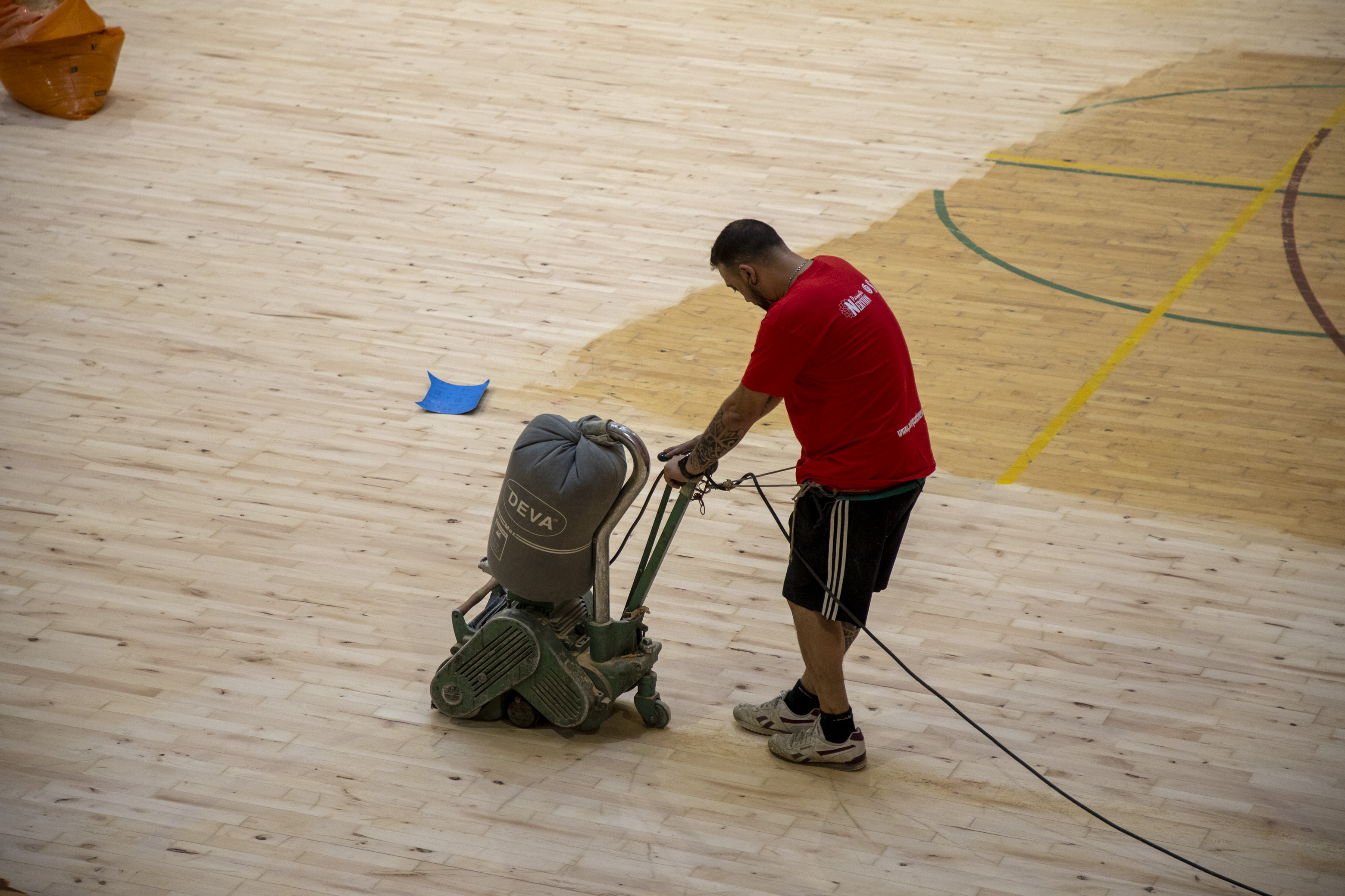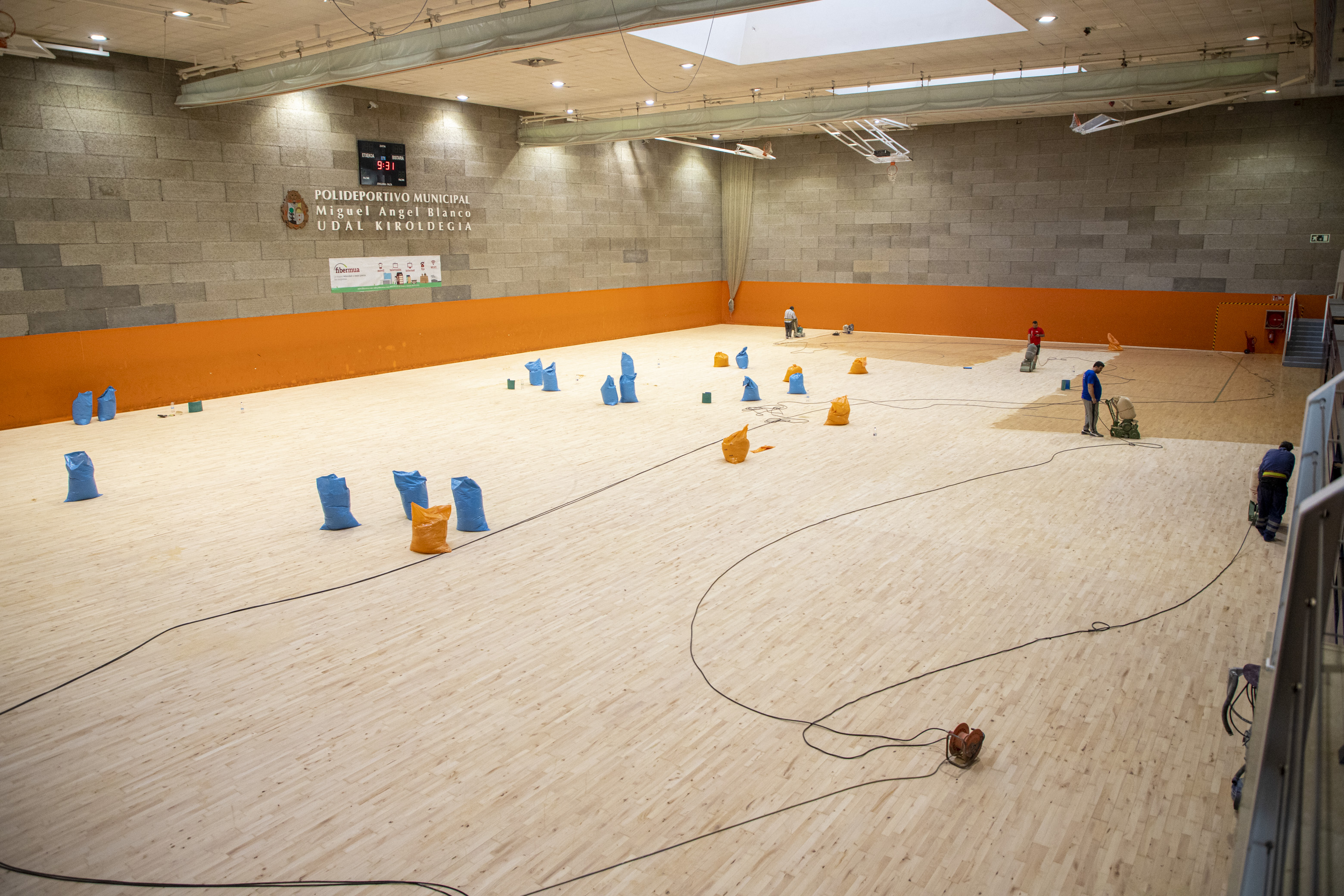 El polideportivo municipal Miguel Ángel Blanco ha iniciado las labores para restaurar el pavimento de la pista central multiusos. Tras años de uso y desgaste, la empresa Parquets Nervión realizará una puesta a punto para dejar la pista en óptimas condiciones.