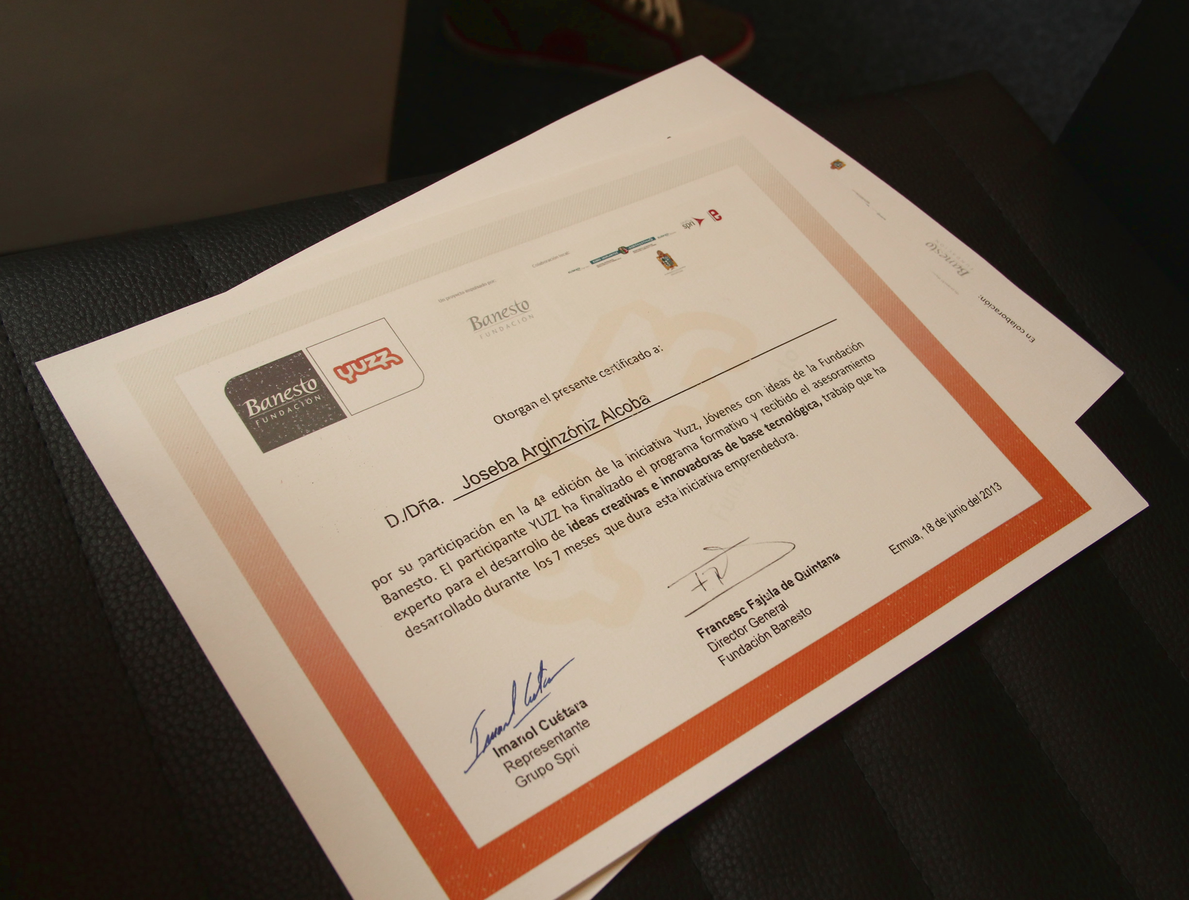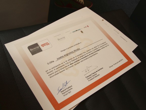 La joven Lara Tubilla Cordero será quien viaje a Silicom Valley para seguir formándose y concretando su proyecto. El curso del Concurso de talento tecnológico Yuzz 2013 para jóvenes entre 18 y 30 años del centro concertado Izarra Centre de Ermua ha llegado a su fin. El grupo de jóvenes de la localidad recibió ayer el diploma que acredita su realización y participación en el curso durante los últimos siete meses, promovido por la Fundación Banesto y SPRI junto con nuestro ayuntamiento. La joven Lara Tubilla Cordero será quien viaje a Silicom Valley, tras ser seleccionado su proyecto ‘Babling’ como mejor propuesta local Yuzz Ermua. La Fundación Banesto ha expedido un certificado a los/as premiados/as y, además, concederá una dotación económica de 60.000€ para premiar los tres mejores proyectos del estado, que se conocerán en breve.