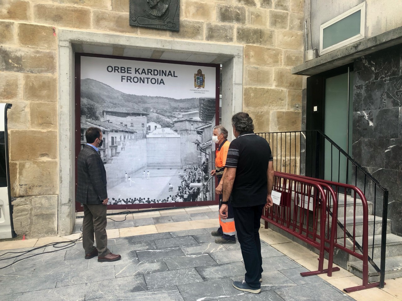 El Ayuntamiento de Ermua ha estrenado este jueves una lona de ‘quita y pon’ en el paso entre Erdikokale y la plaza Cardenal Orbe. Este elemento, decorado con imágenes históricas de la plaza de la localidad, se colocará en este espacio durante los torneos o competiciones de pelota o pala, para impedir el paso de viandantes y evitar así posibles pelotazos.
