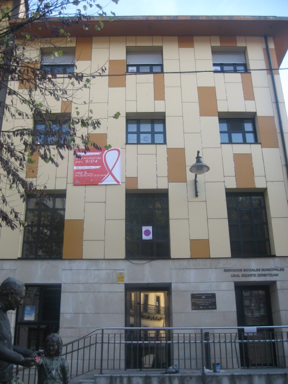 Imágenes de una lona colocada en el edificio de Servicios Sociales.