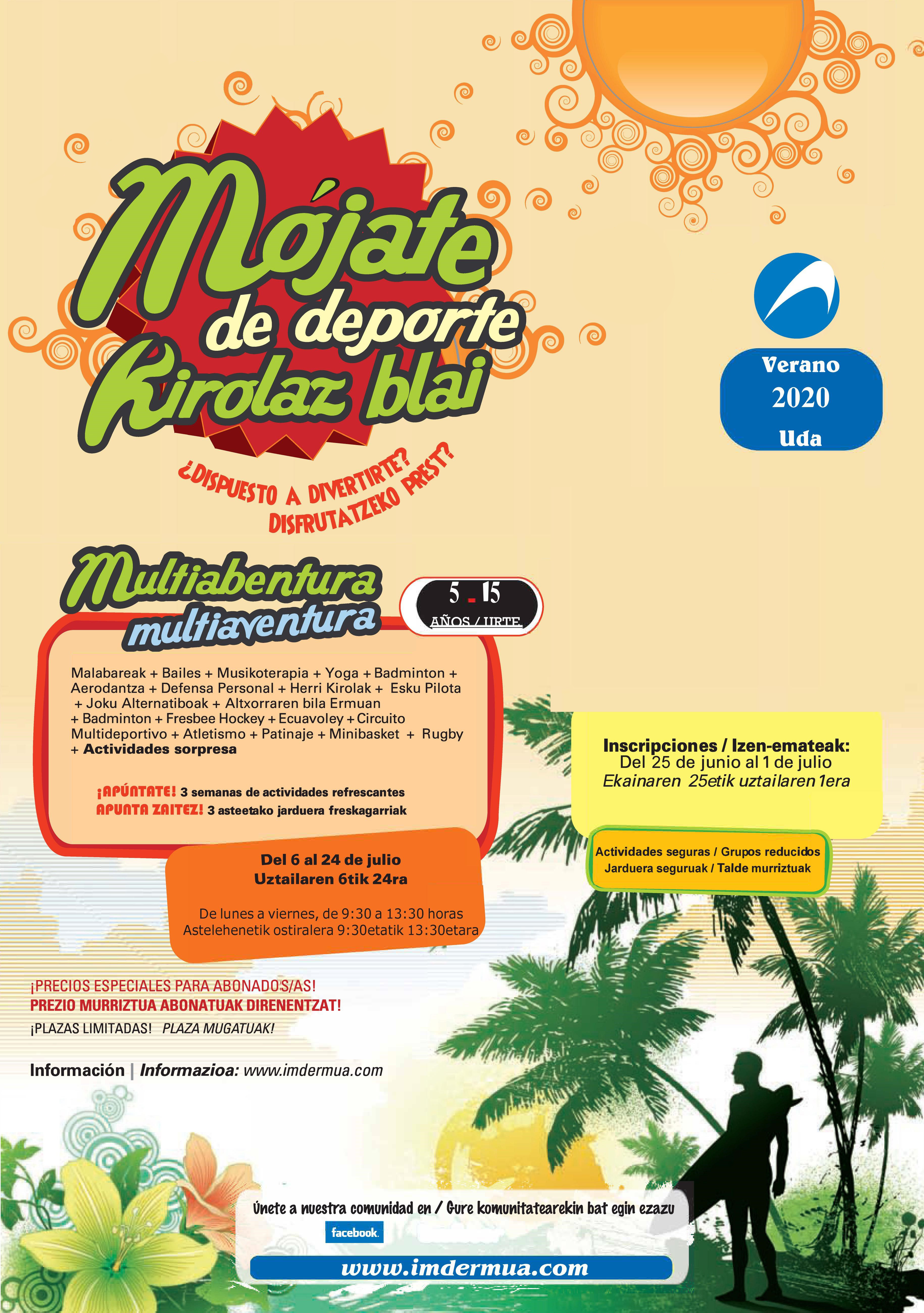 El Área de Deportes y el polideportivo municipal Miguel Ángel Blanco han organizado las colonias deportivas Multiaventura para niños y niñas de entre 5 y 15 años. Las actividades se desarrollarán del 6 al 24 de julio, y se adaptarán a la situación de emergencia sanitaria originada por la pandemia del coronavirus.