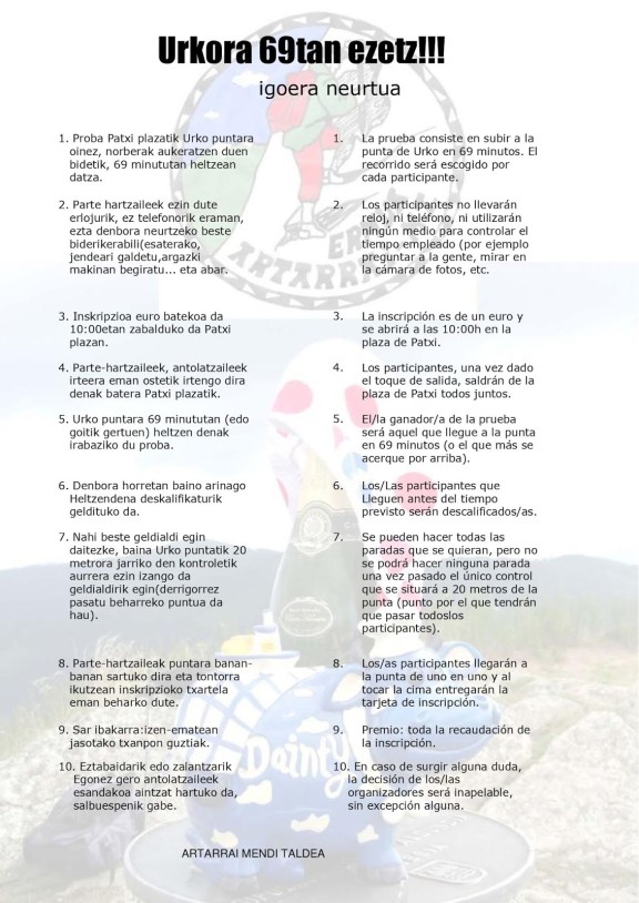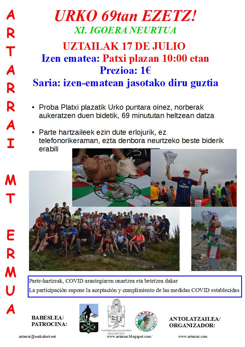Tras un año de parón por la pandemia del Covid-19, Artarrai Mendi Taldea vuelve a organizar una nueva edición de la prueba Urko 69an ezetz! El ya popular reto consiste en subir desde la plaza Patxi hasta la cima del monte Urko en exactamente 69 minutos.