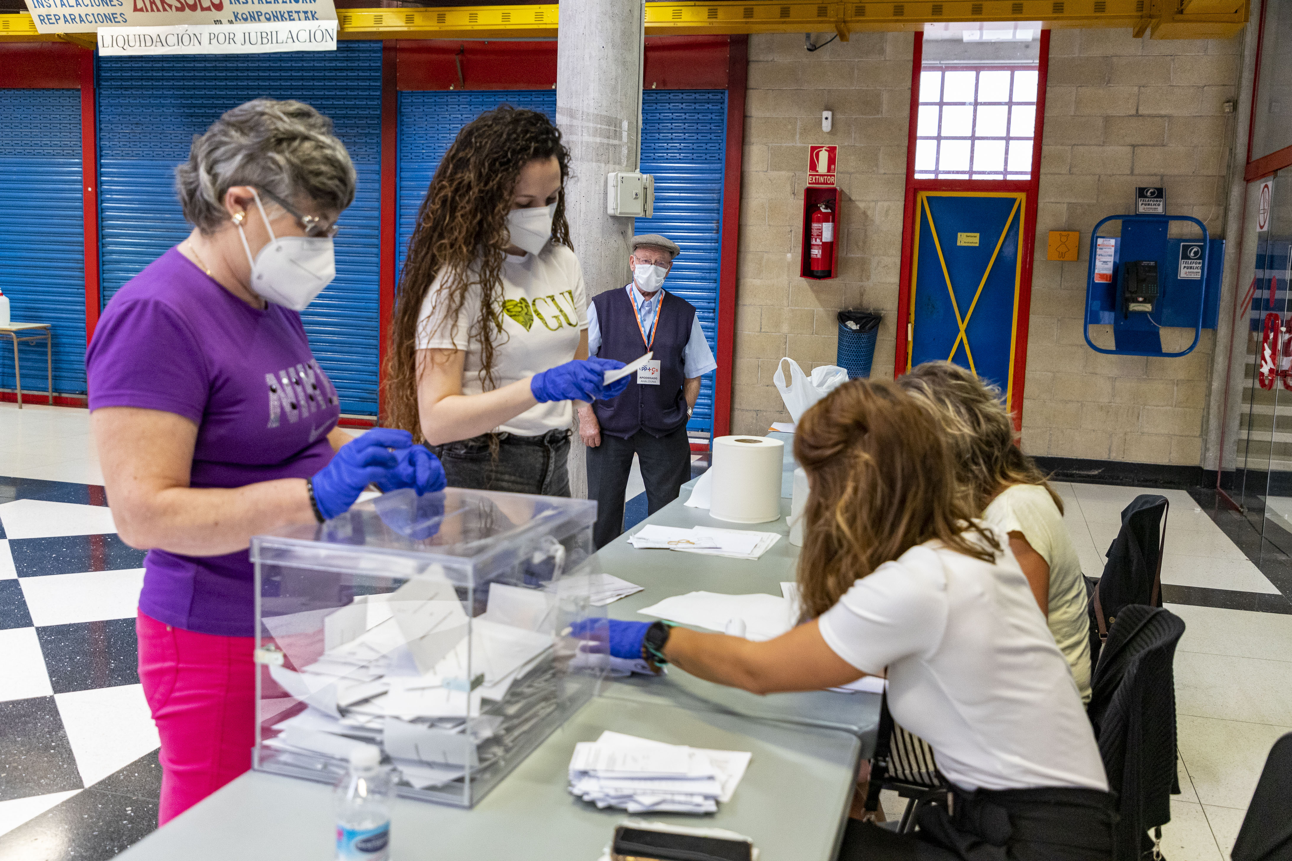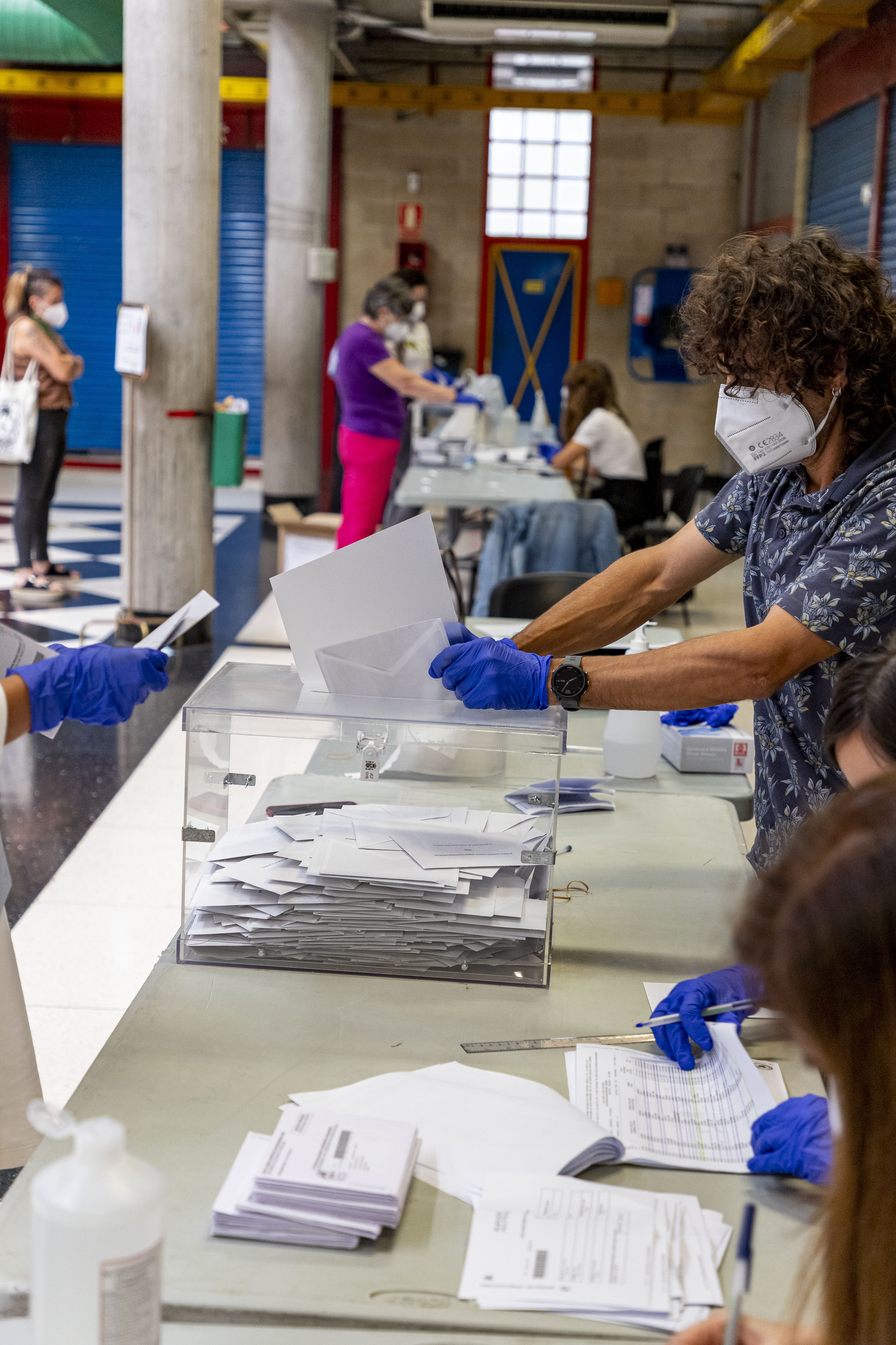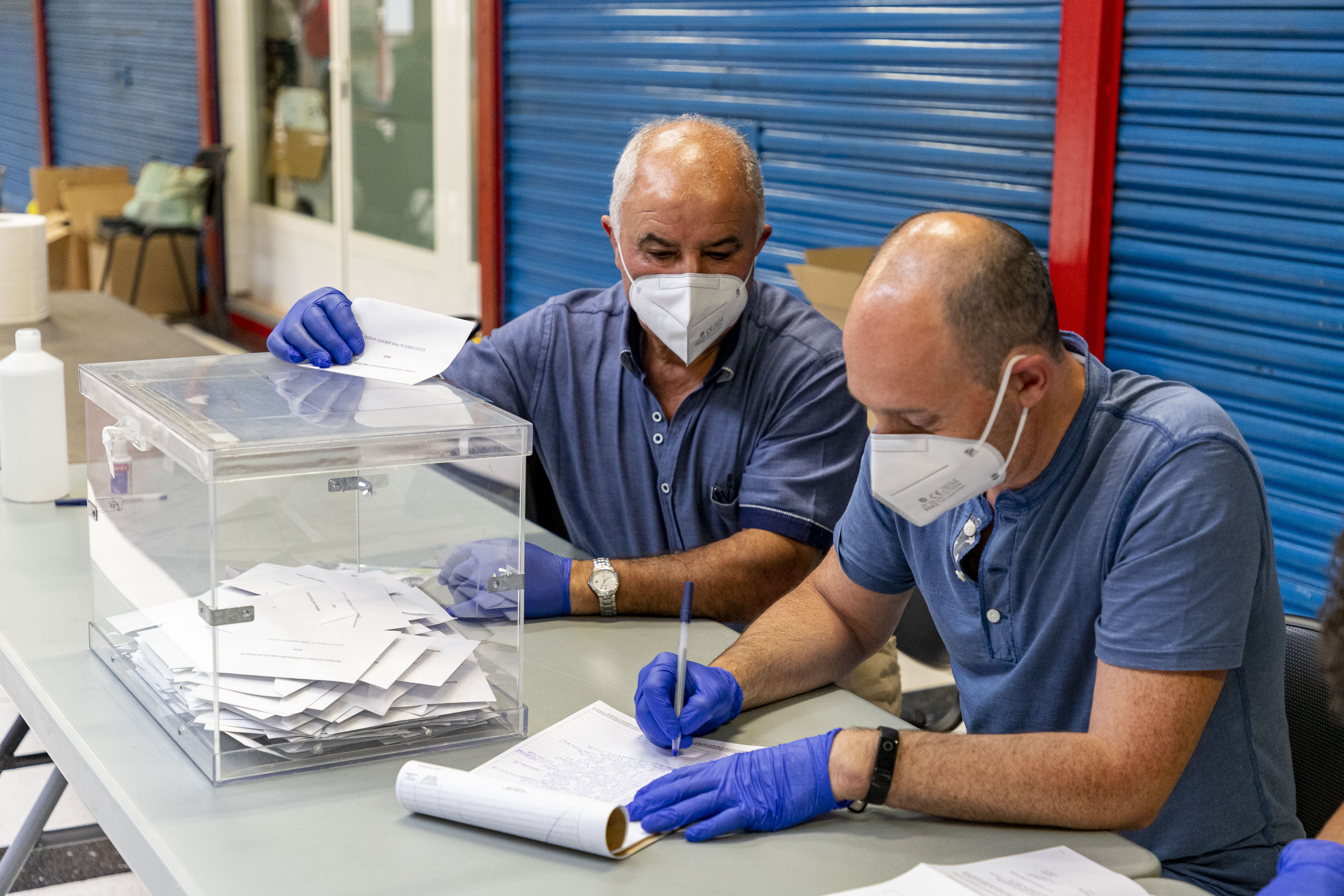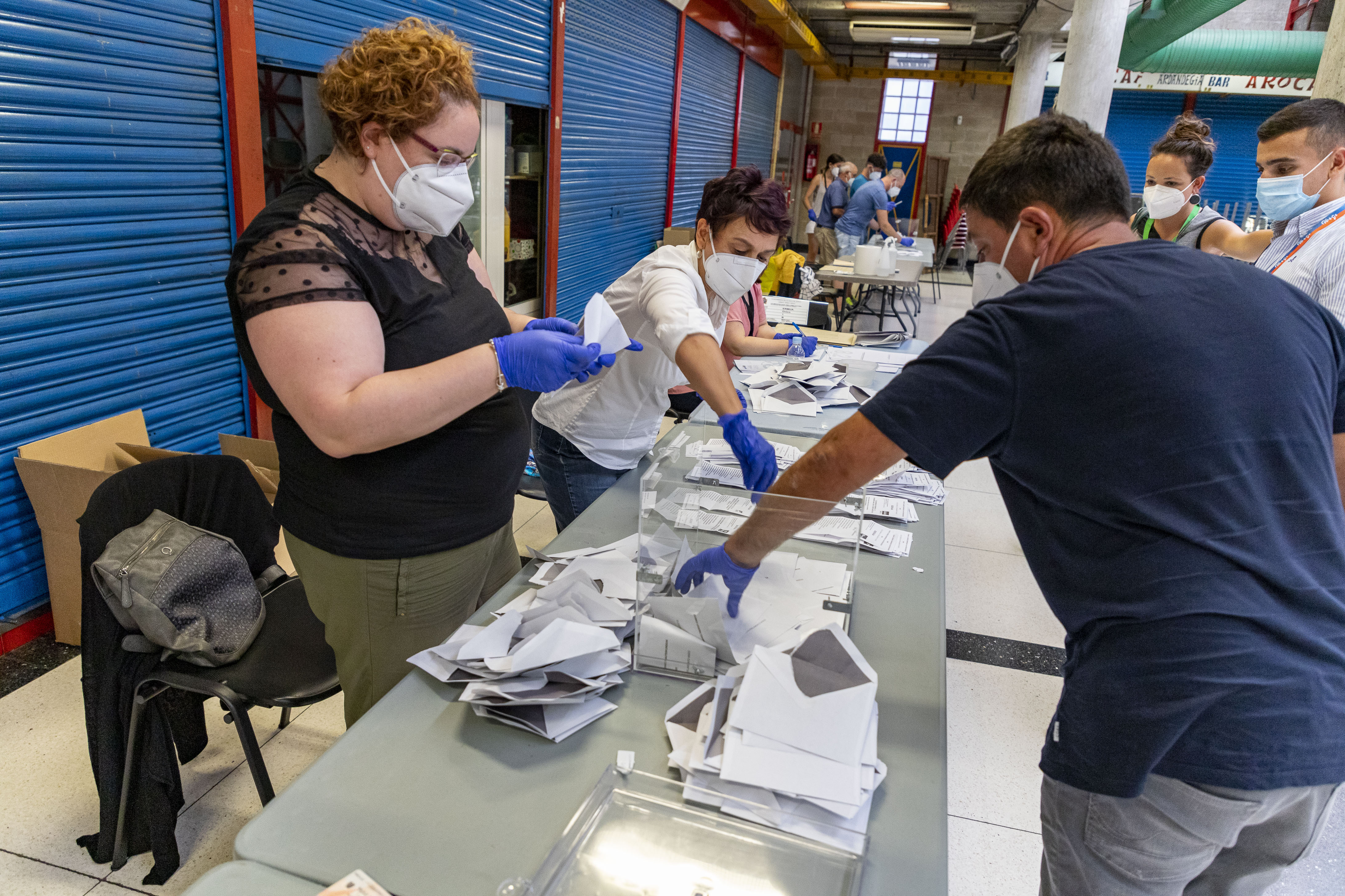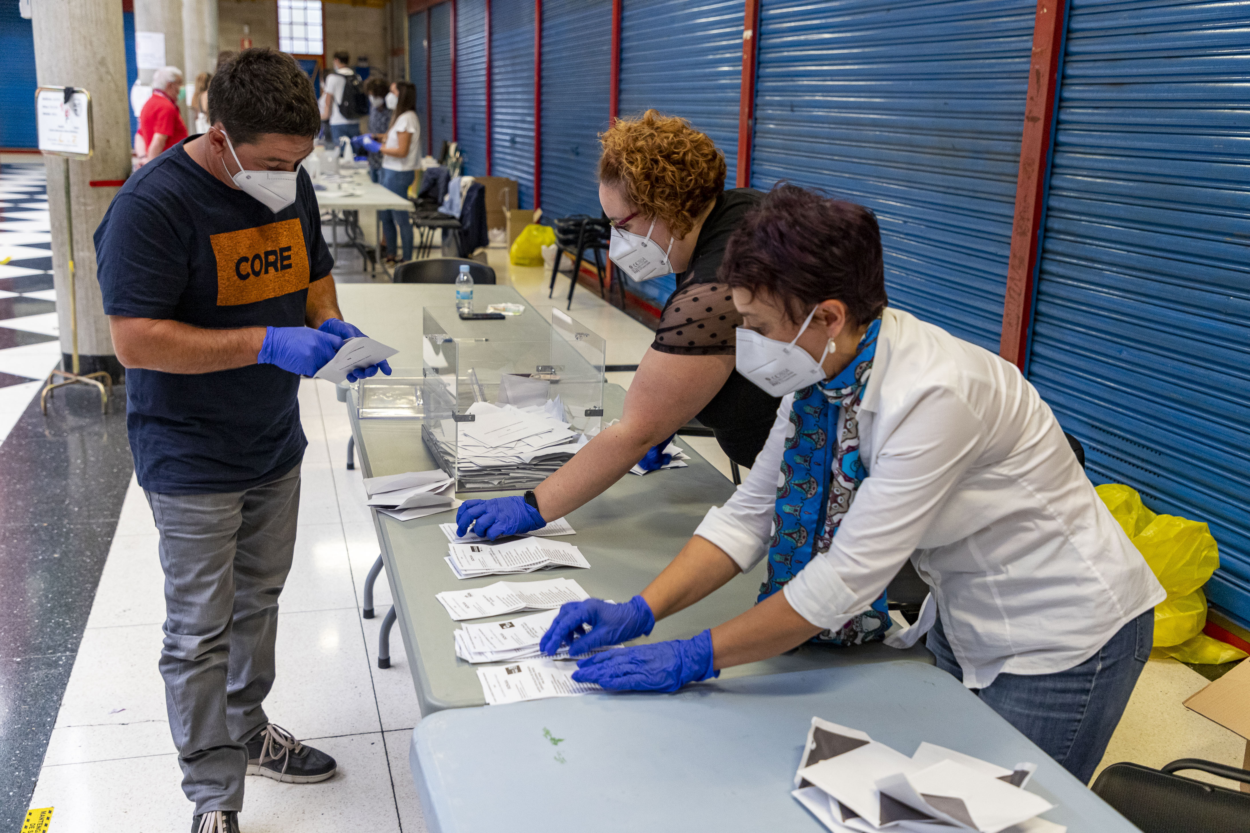 La galería muestra las diferentes mesas y secciones de la plaza del Mercado de Ermua recibiendo e introduciendo el voto recibido por Correos y en labores de recuento hoy domingo 12 de julio de 2020.