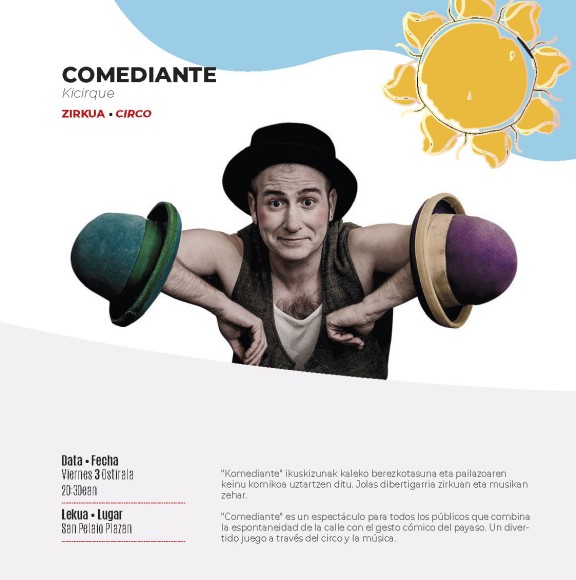 Ermua abrirá mañana un programa cultural de actividades y espectáculos de calle que se desarrollará a lo largo de los cuatro fines de semana de este especial mes de julio, en este año de pandemia. Etxetik plazara es el nombre de este programa de acciones de dinamización cultural en un año en el que no celebraremos las fiestas patronales. Un programa 16 espectáculos de calle y una exposición en la vuelta de la actividad cultural de nuestro municipio, adaptada a las condiciones de la ‘nueva normalidad’. Actividades variadas que incluyen teatro, payasos, música, danza, circo, bertsolarismo o arte… tanto para el público infantil como para el adulto.