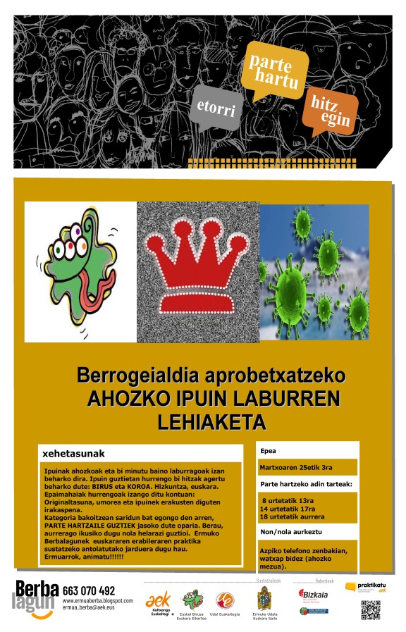 Euskarazko ahozko ipuin edo narrazio laburren lehiaketa antolatu du herriko 'Berbalagun' ekimenak, berrogeialdia eta konfinamendua eramangarriago egiteko, baita euskara praktikatu ahal izateko ere. Parte hartu nahi dutenek grabaturiko ipuin edo narrazio bat bidali behar dute Watxap bidez 663 070 492 telefono zenbakira, gehienez ere bi minutukoa. Bertan, nahitaez, koroa eta birus hitz gakoak erabili behar dira. Lehiaketa atzotik zabalik dago eta apirilaren 3ra arte iraungo du. Hiru adin talde aurreikusi dituzte antolatzaileek.