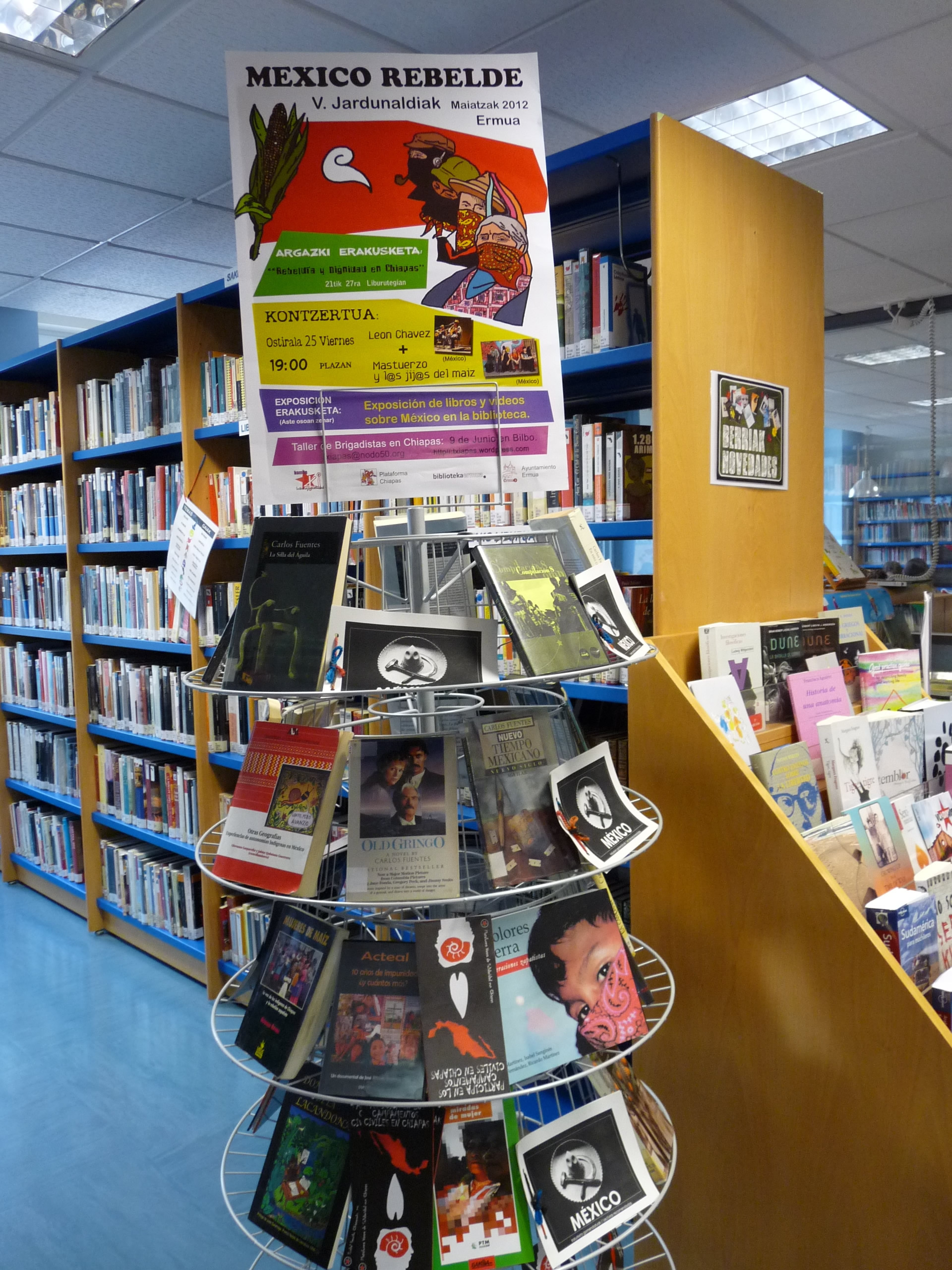 Exposición de fotografías y materiales de las Jornadas México rebelde en el hall de la Biblioteca de Ermua. Guía de lectura y audiovisuales.