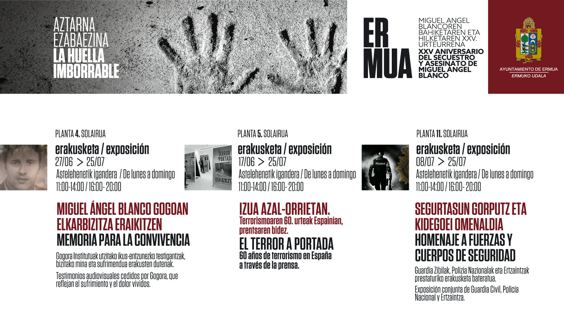 Las exposiciones temáticas del programa ‘La huella imborrable’ que aglutina las actividades programadas en el XXV. aniversario del secuestro y asesinato del concejal Miguel Ángel Blanco, ubicadas en Izarra Centre han cubierto su ecuador. Esas exposiciones estarán abiertas hasta el próximo día 25 y podemos visitarlas en el siguiente horario: de 11 a 14 horas y de 16 a 20 horas. La entrada es libre y gratuita.