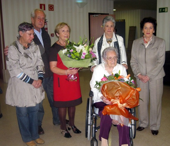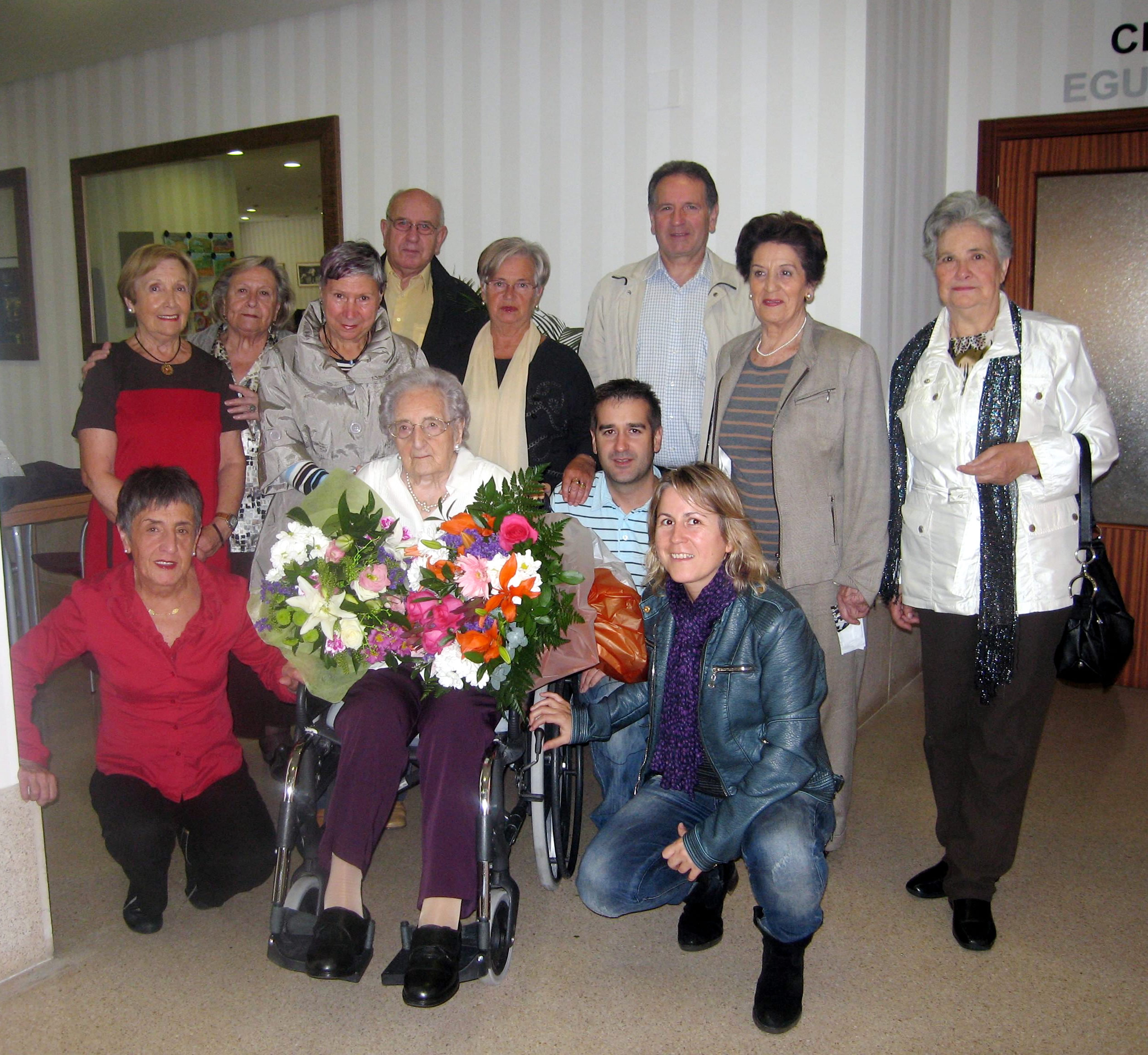 La vecina Victoria Arriaga Rementería ya es centenaria. La viuda de Tomás Lasuen cumplió cien años de vida en el día de ayer. Todo un hito, que no alcanzamos todas las personas. Y menos con esa presencia, porque está muy guapa físicamente y lúcida mentalmente. Esta mañana representantes de la Diputación Foral, de Vitalitas y de la Asociación Nagusilan se han acercado hasta la Residencia de Abeletxe para rendir homenaje y darle testimonio de cariño a Victoria.