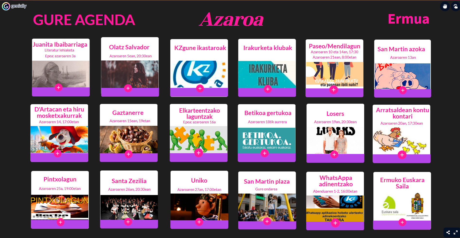 Udal euskara sailak iraileko ‘Gure Agenda' hilabetekari digital berria eta interaktiboa ezagutzera eman du Azaroko bildumak, besteak beste, Antzokian asteburuetan euskaraz ikusi ahal izango ditugun as ikuskizunen berri ematen du, esaterako: ‘Olatz Salvadorren' emanaldia, KZgunearen askotariko ikastaro aberasgarriak, irakurketa-klubak, Berbalaguneko jarduerak, Gaztanerre eta ‘Losers’ antzezpena edo San Martin azoka herrikoia, besteak beste.