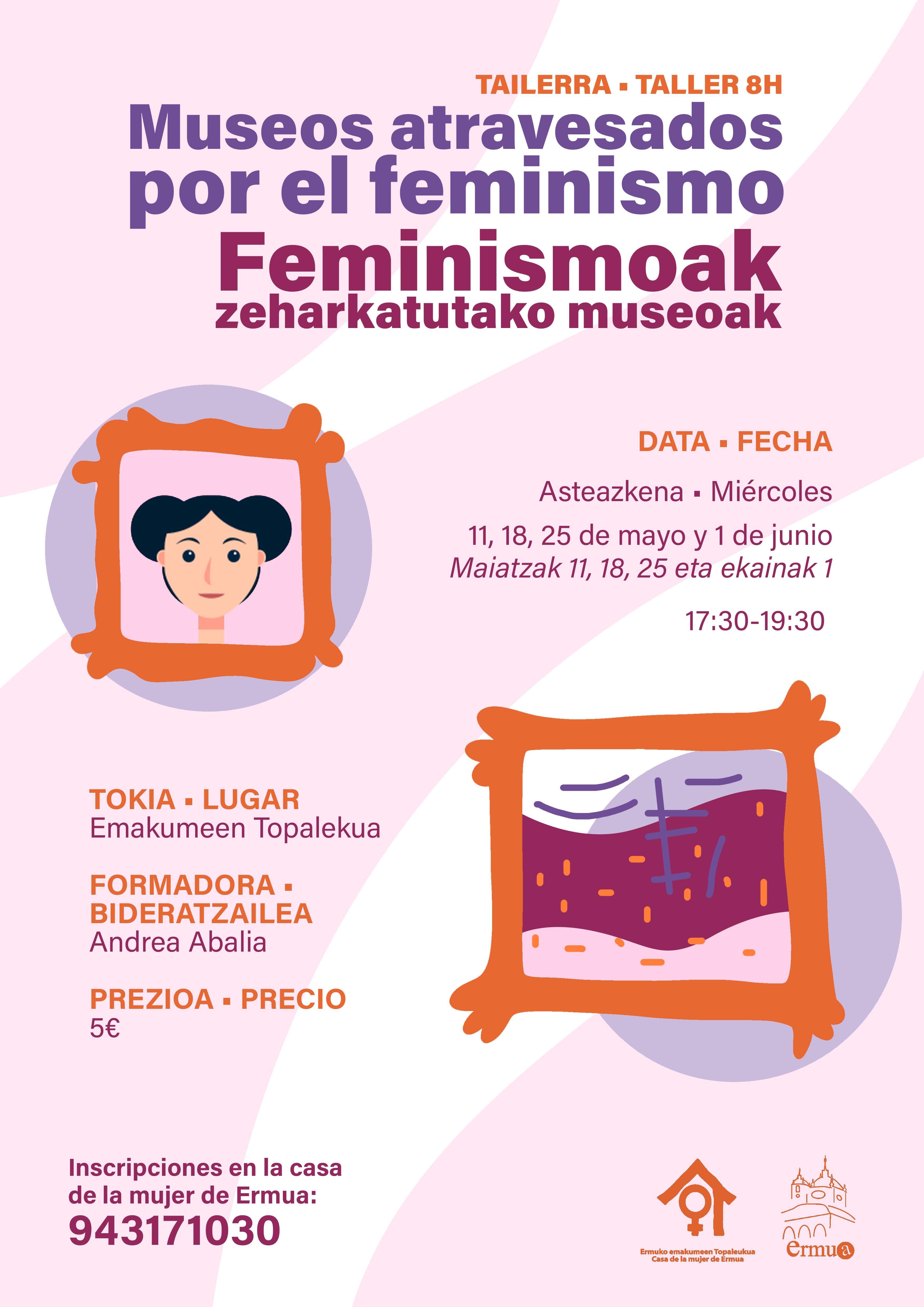 La Escuela de Empoderamiento de la Casa de la Mujer de Ermua ofrece este mes de mayo un nuevo taller titulado Museos atravesados por el feminismo. El curso, de 8 horas de duración, permitirá a sus participantes introducirse en el mundo del arte con gafas moradas, para poder tener así una perspectiva feminista de la teoría y la producción artística.