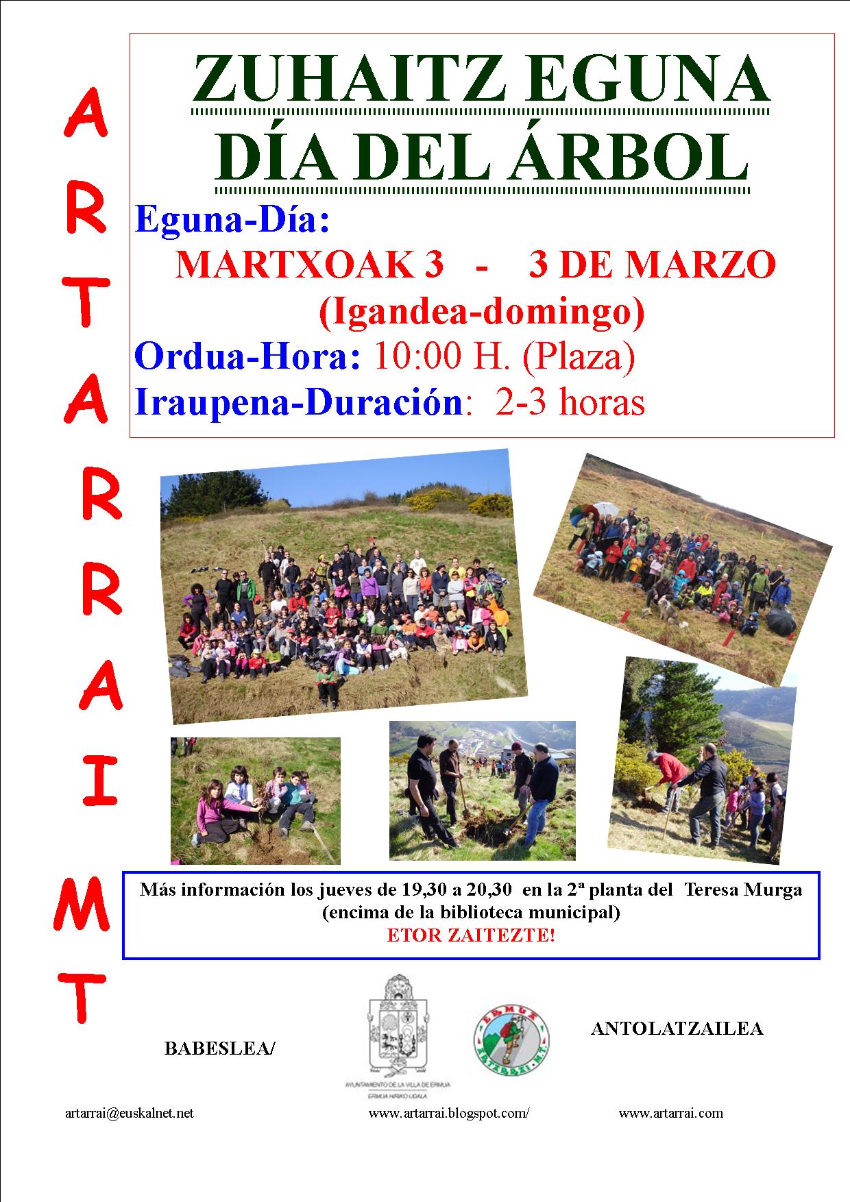 Artarrai Mendi Taldea celebrará una nueva edición del día del árbol, este domingo día 3 de marzo. Plantará dos centenares de ejemplares autóctonos en la ladera que queda encima del depósito de aguas de San Lorenzo. Esta iniciativa que se puso en marcha hace dos años tiene como objetivo principal inculcar el respeto por la naturaleza y nuestra flora y fauna, para lo cual como en ediciones precedentes se plantarán árboles autóctonos en la ladera de Joxio, sito encima del depósito de aguas de San Lorenzo./Artarrai Mendi taldeak III. Zuhaitz eguna antolatu du, martxoaren 3ko iganderako. Aurtengo hirugarren edizioan berrehun zuhaixka landatuko ditu, Joxio izeneko magalean, ur-biltegiaren gainean. Horretarako, aurreko edizioetan legez, bertako hainbat zuhaitz landatuko dira, haritzak, pagoak, haginak, mizpirak... ia berrehun zuhaitz.