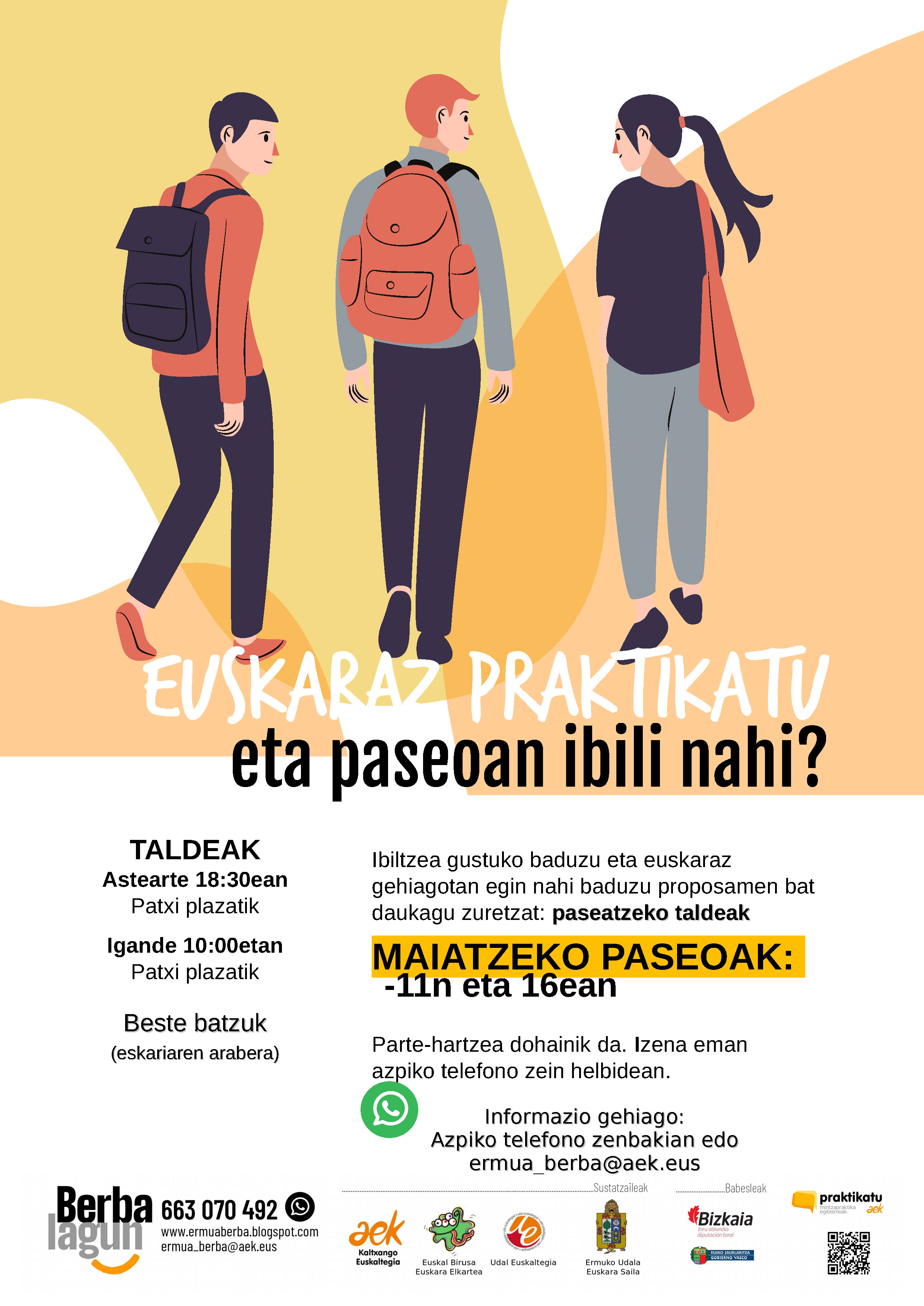'Berbalagun' jardueraren koordinatzaileak ezagutarazi duenez, hilabete honi dagokion 'Paseolagun' jarduera datorren astean egingo dute. Taldeak datorren asteko astearte eta igandean bilduko dira, maiatzaren 11n eta 16ean, hain zuzen ere.