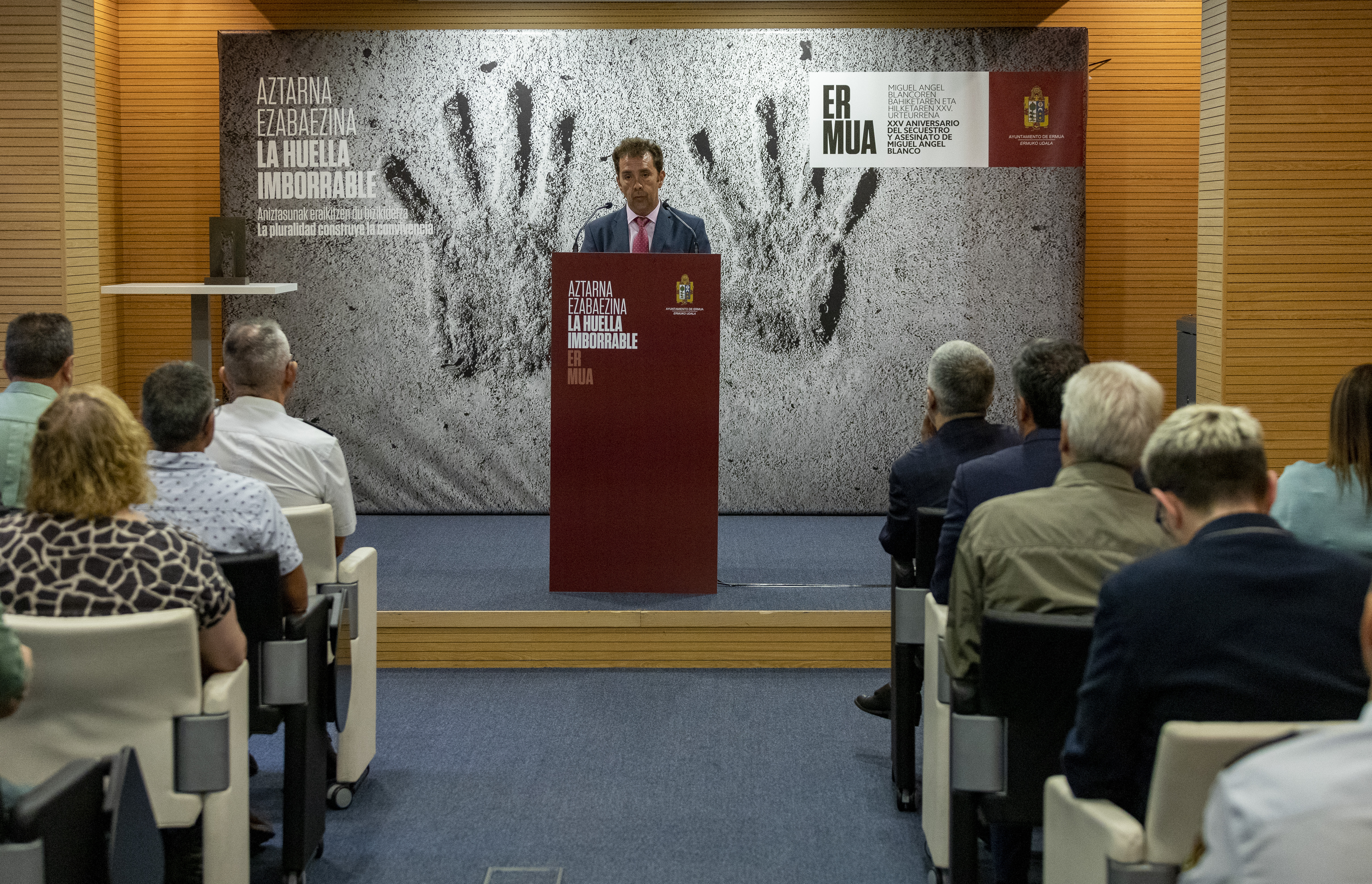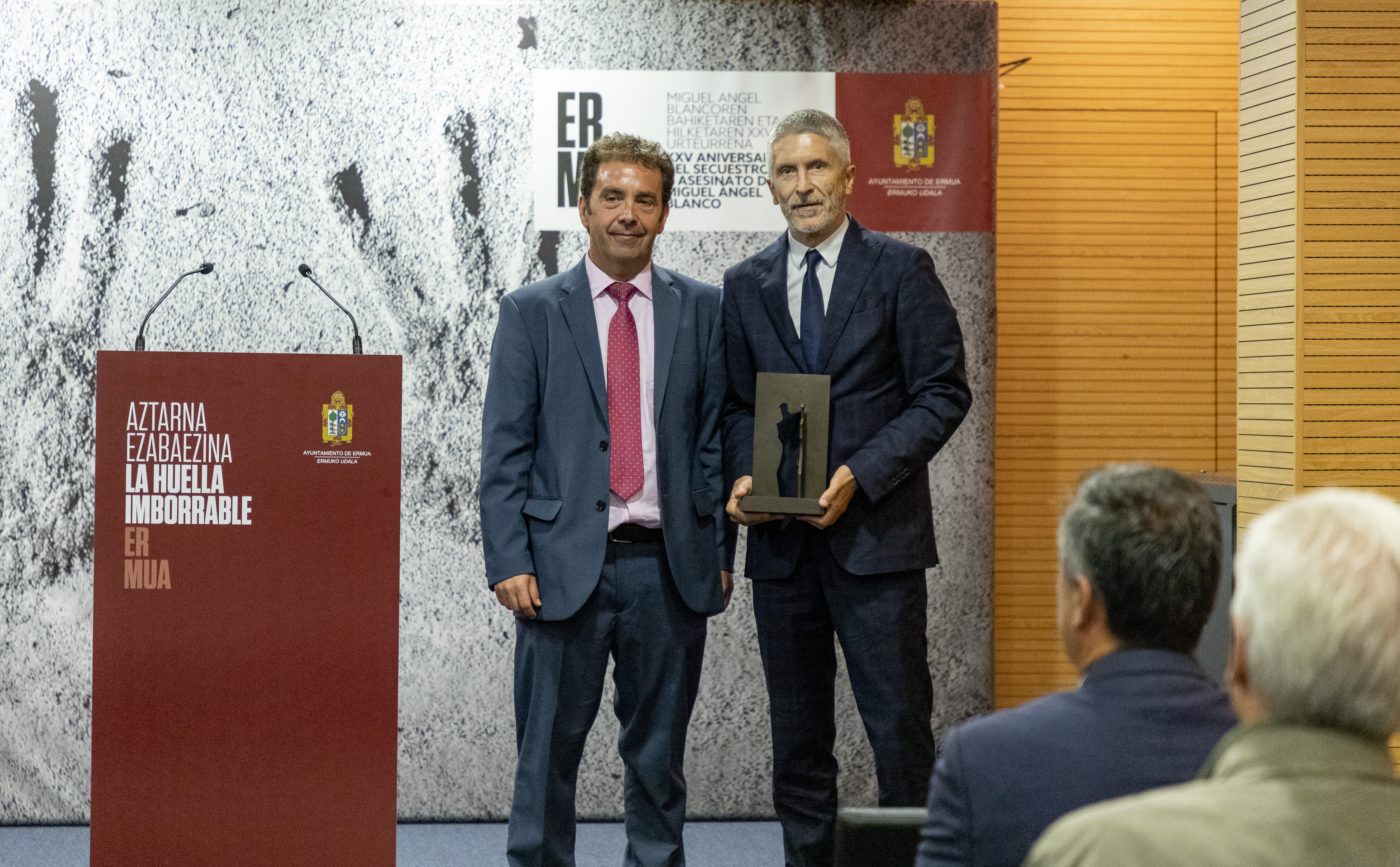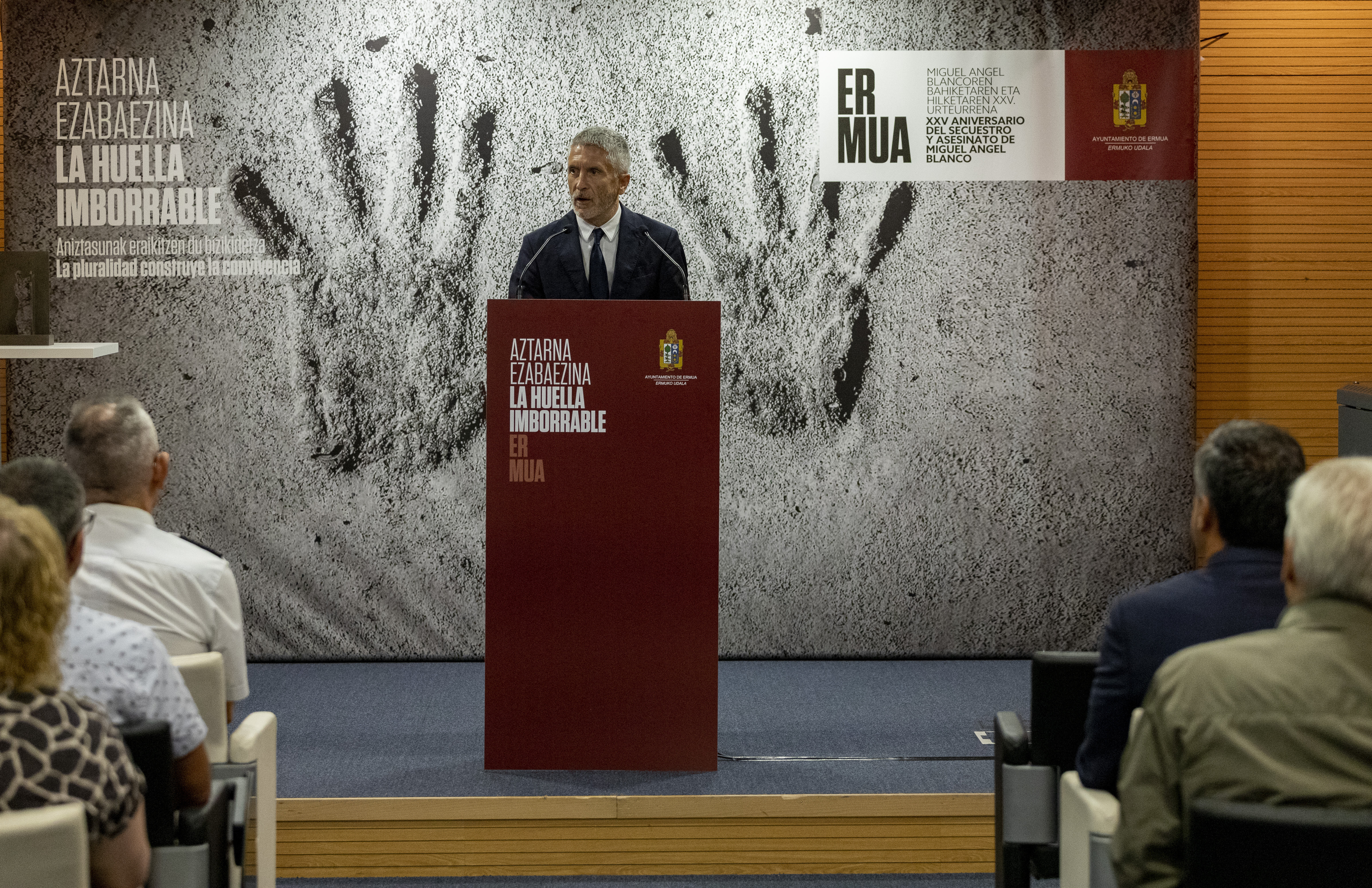 El ministro del Interior del Gobierno de España, Fernando Grande-Marlaska, ha asistido este miércoles a las instalaciones de Izarra Centre para visitar las exposiciones del programa La huella imborrable, en memoria del XXV. aniversario del secuestro y asesinato del concejal Miguel Ángel Blanco.
