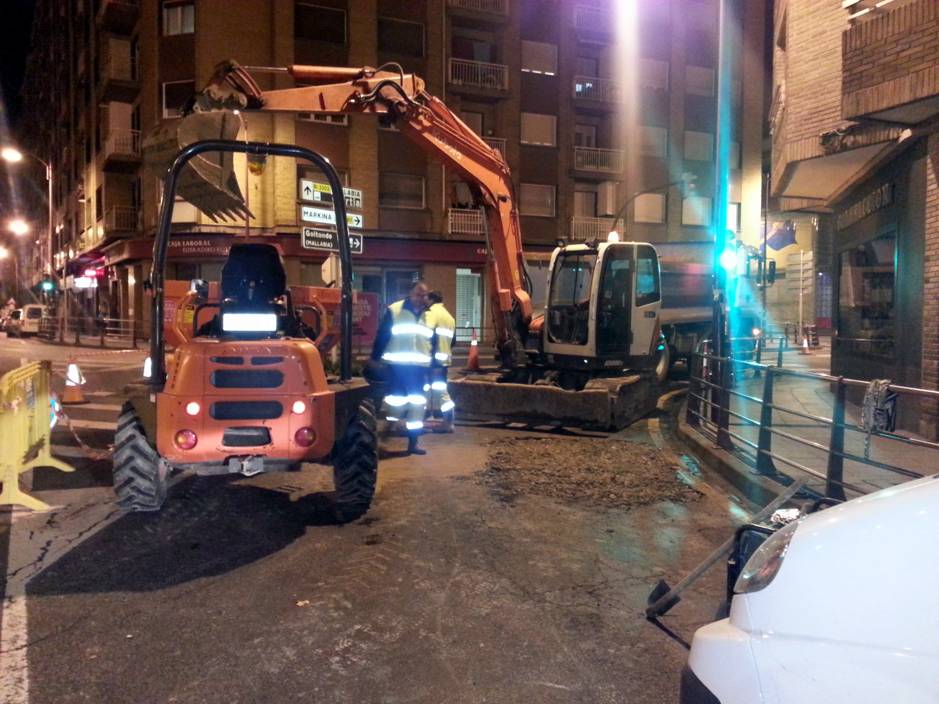 Operarios de 'Aquagest' trabajando en la calle Marqués de Valdespina 16 de Ermua, para reparar una tubería de la red de agua potable que fugaba.
