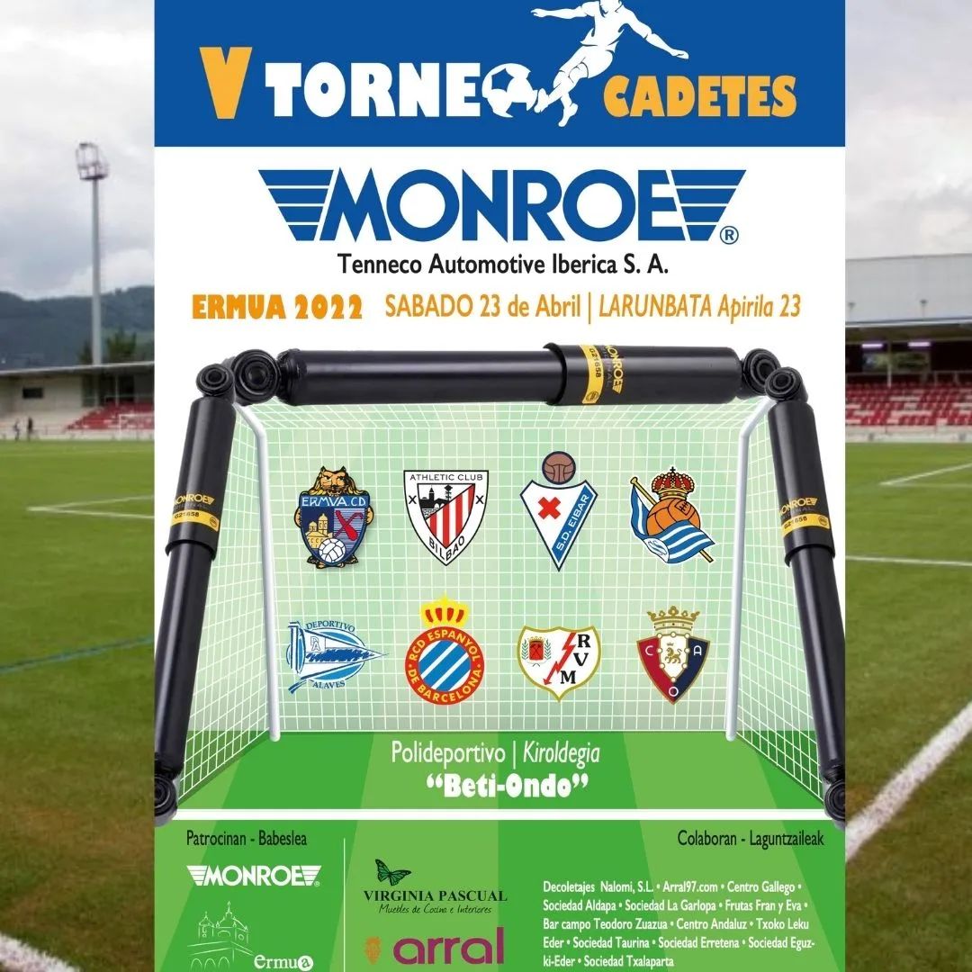 El Club Deportivo Ermua ha organizado la quinta edición del Torneo de Fútbol Cadete Tenneco Monroe. Tras dos años de parón por la pandemia del Covid-19, el campeonato tendrá lugar el sábado 23 de abril en el campo municipal Teodoro Zuazua y en la zona deportiva Betiondo.