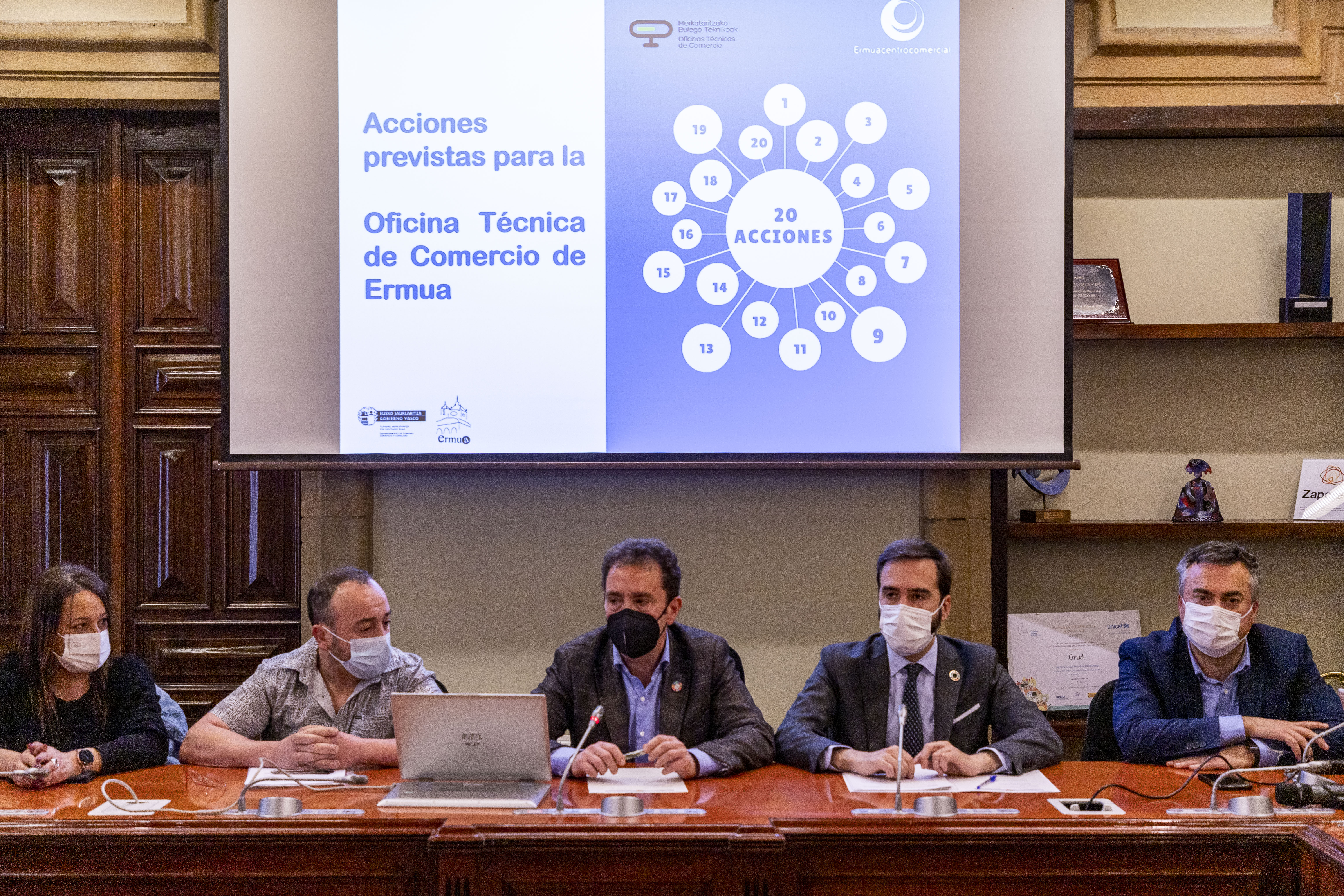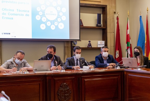 El consejero de Turismo, Comercio y Consumo, Javier Hurtado, el alcalde de Ermua Juan Carlos Abascal, y el presidente de la Asociación de Comercio y Hostelería de Ermua (ACHE) Aitor Rupérez, han presentado hoy la Oficina Técnica de Comercio de Ermua que reforzará la atención al sector en la comarca del Bajo Deba.