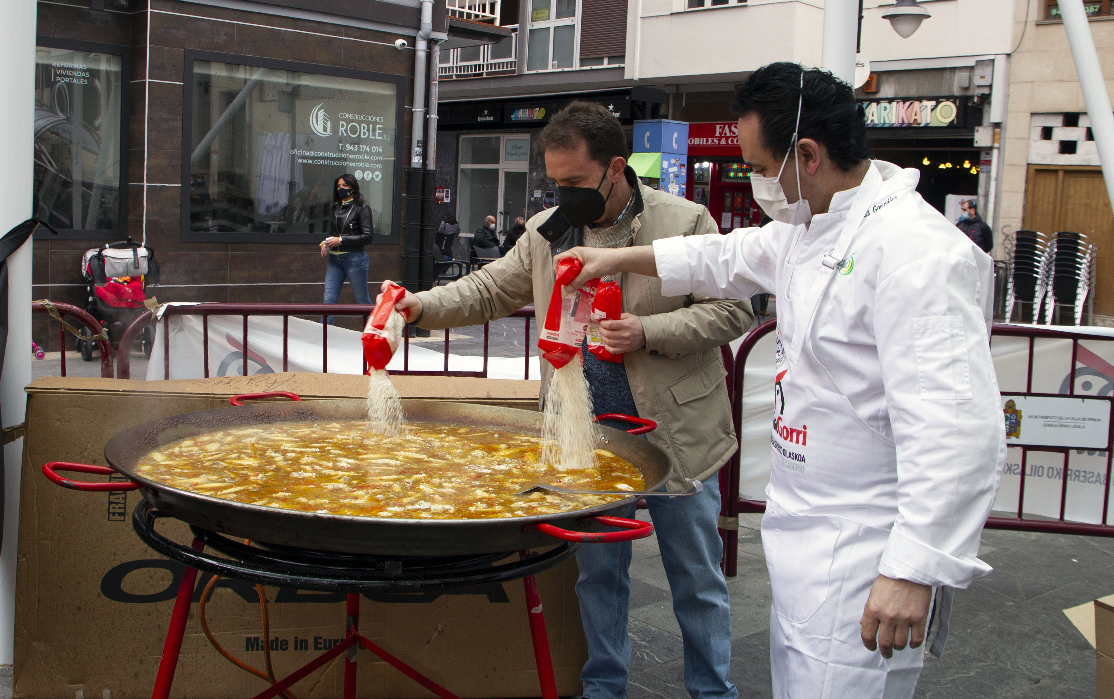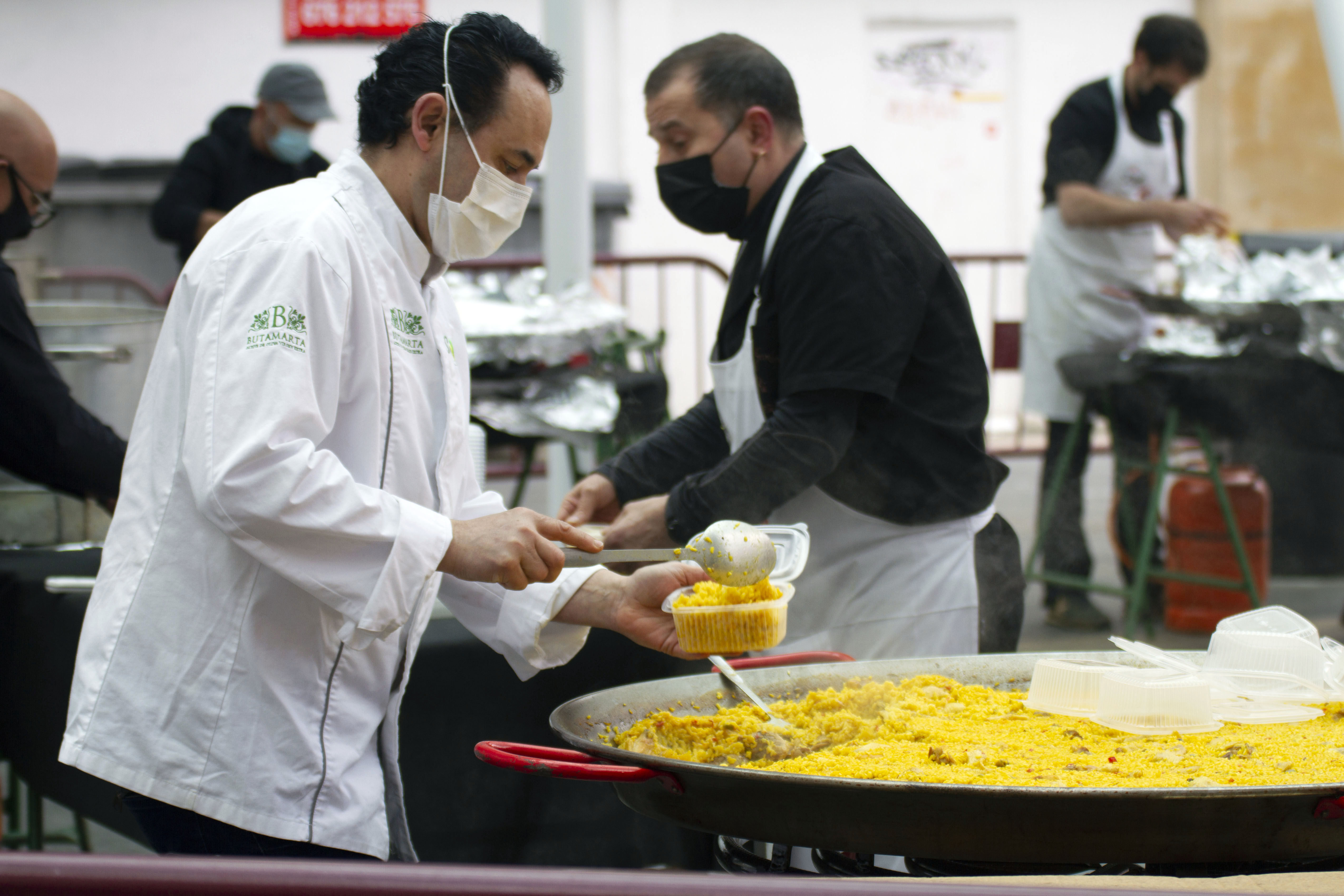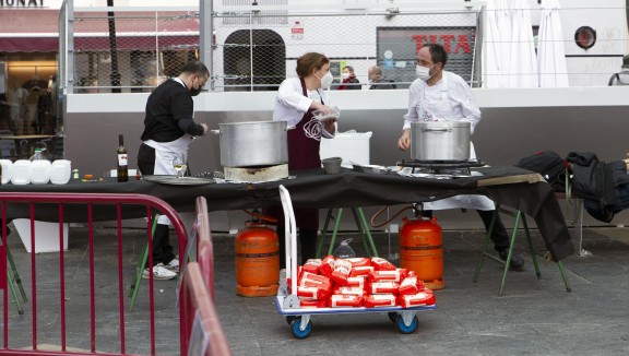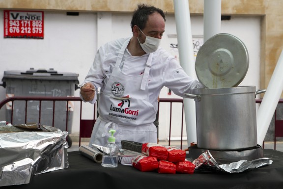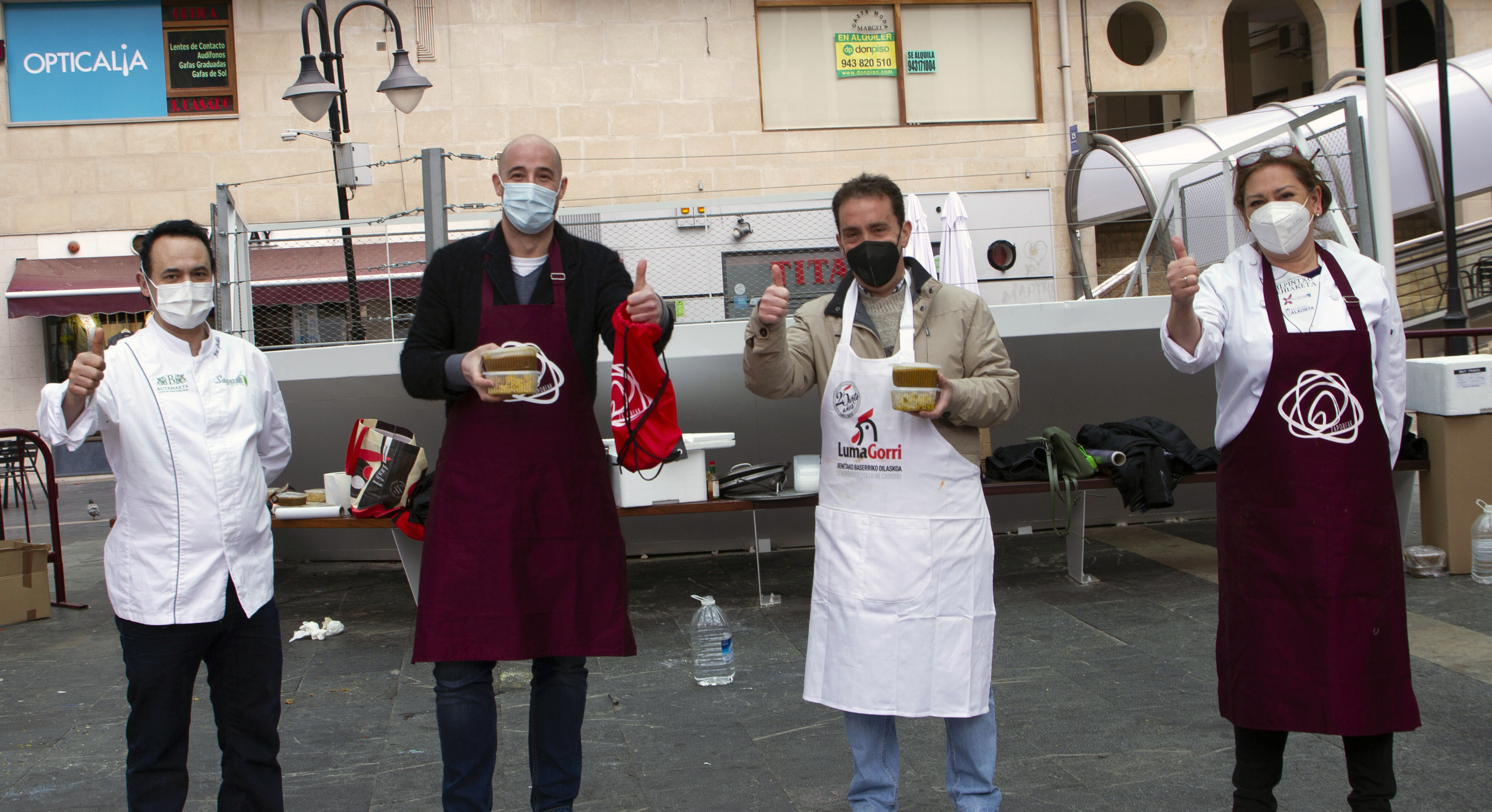 Veinte cocineros/as de Euskadi trabajaron con ahínco el sábado para preparar raciones en la actividad ‘tupper solidario’ que organizó la ONG Zaporeak para recaudar víveres y fondos para atender las necesidades de las personas refugiadas en la isla griegas de Lesbos.