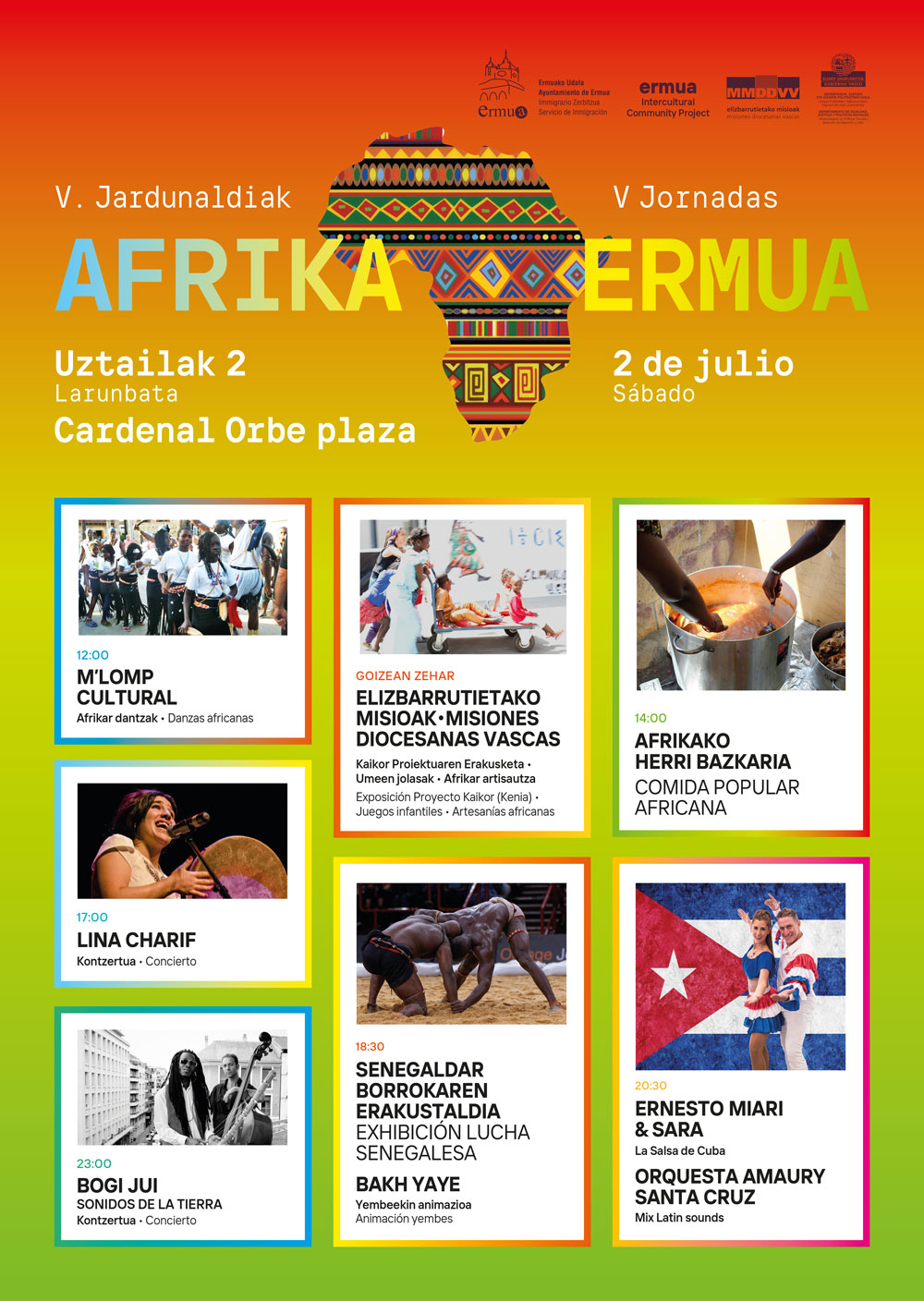 El Departamento de Inmigración y Cooperación Internacional del Ayuntamiento de Ermua celebra este sábado 2 de julio la quinta edición de las jornadas Afrika – Ermua. Diversos colectivos reunidos en torno al proyecto Ermua Intercultural Community Project colaboran en esta iniciativa, cuyo objetivo es compartir la cultura gastronómica y artística de diferentes regiones africanas con la población de Ermua.