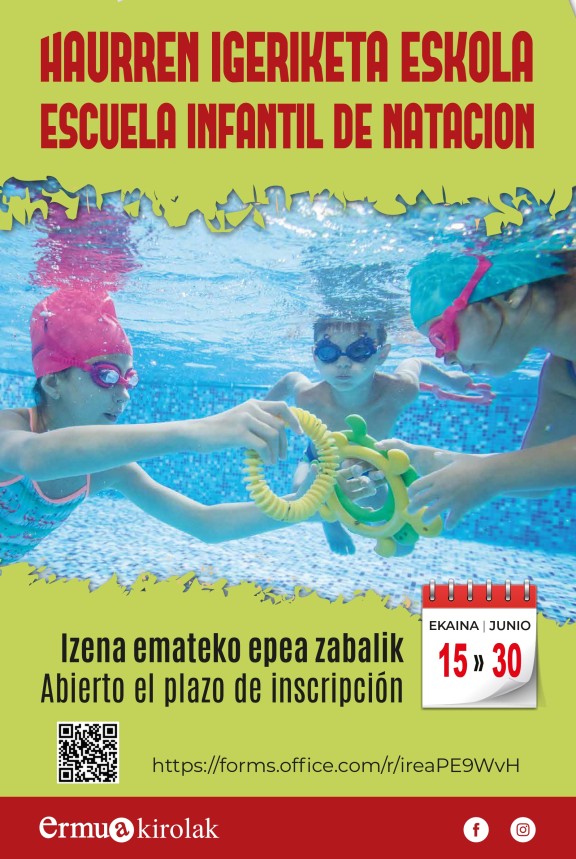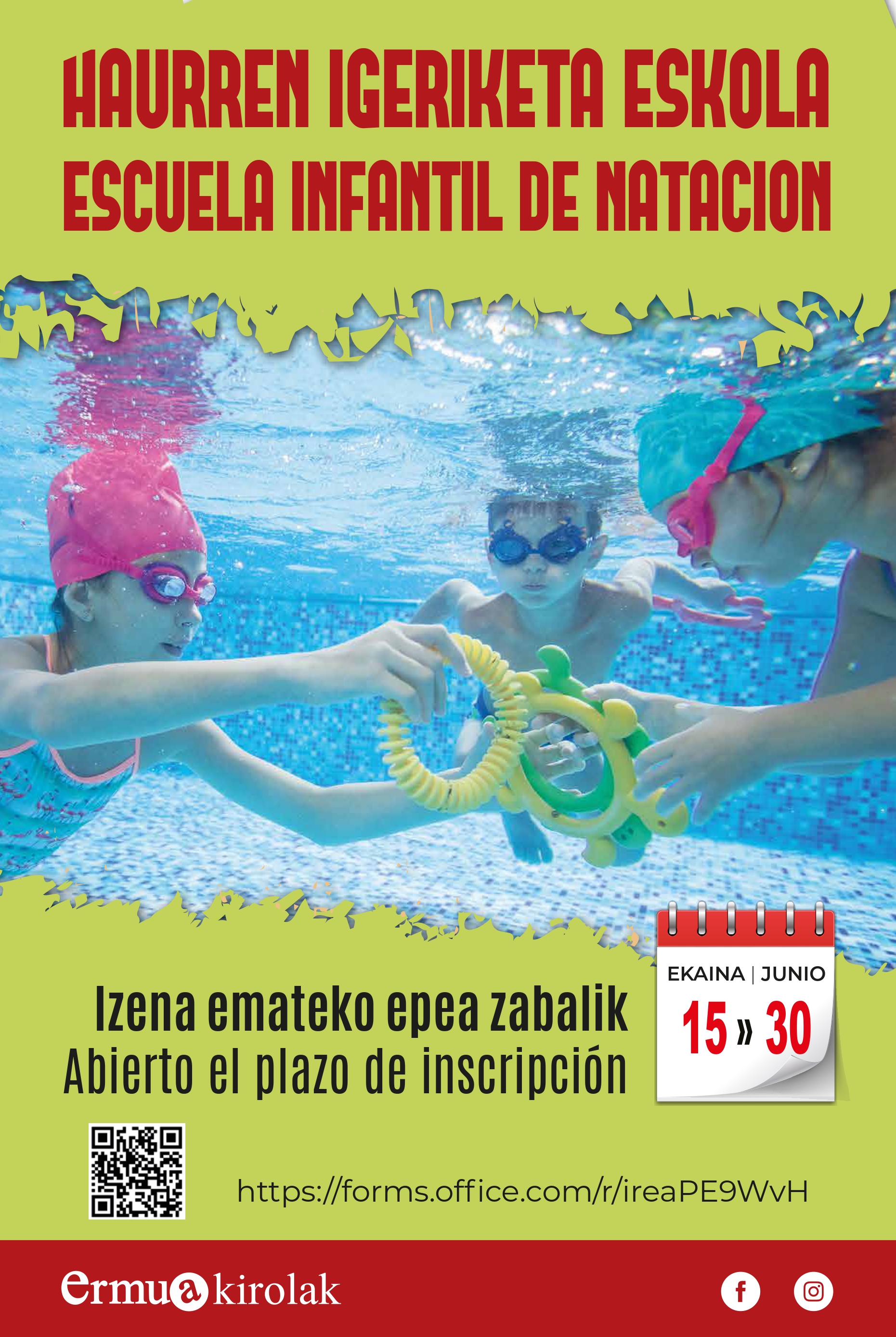El Área de Deportes del Ayuntamiento de Ermua ha abierto el plazo de preinscripción para todos los niños y niñas que quieran participar por primera vez en la escuela infantil de natación. Así, todas aquellas personas nuevas que quieran comenzar en septiembre en el nivel 0 (nacidas en 2019) o en los niveles del 1 al 7 (nacidas en 2018 o antes), deberán cumplimentar un formulario electrónico antes del 30 de junio.