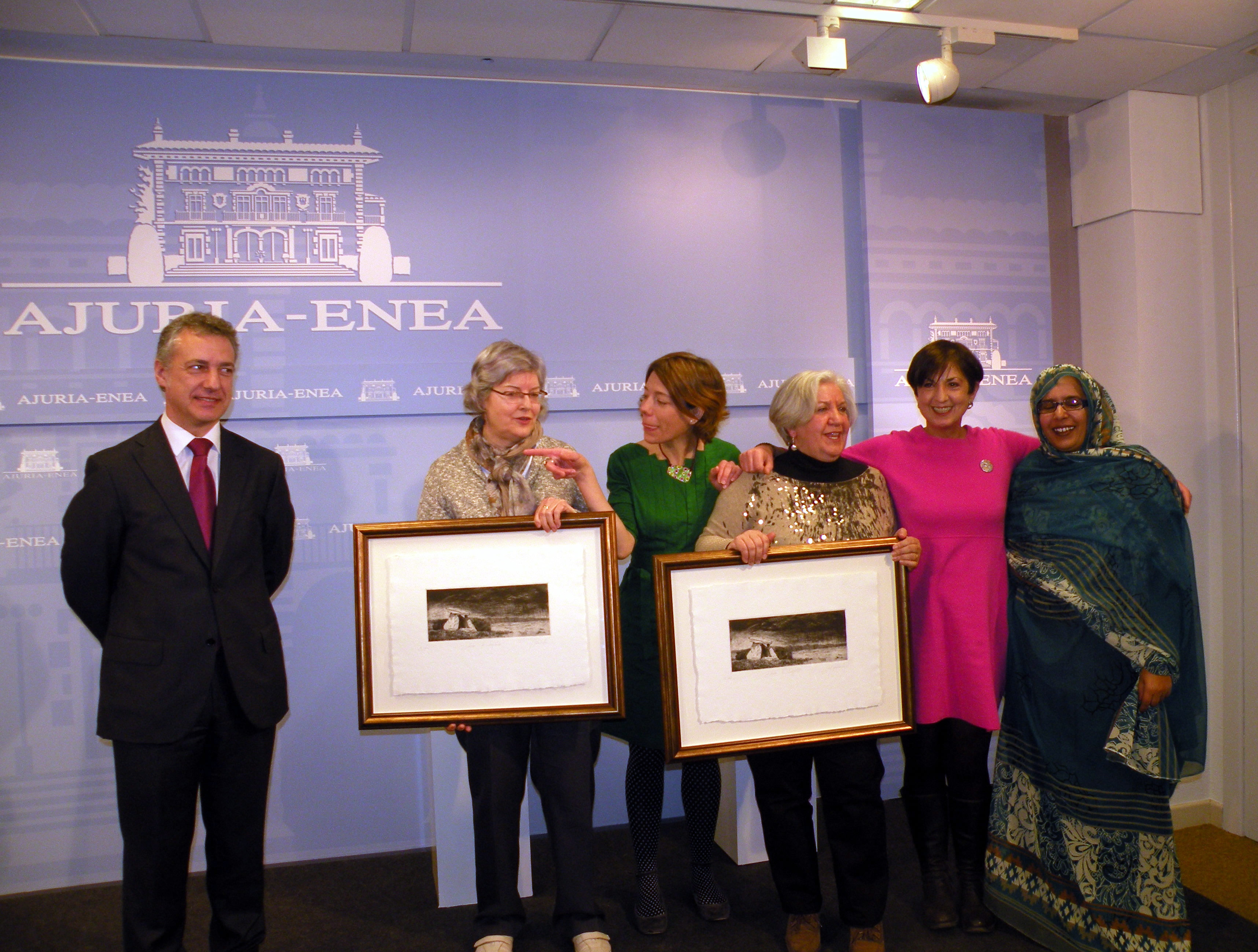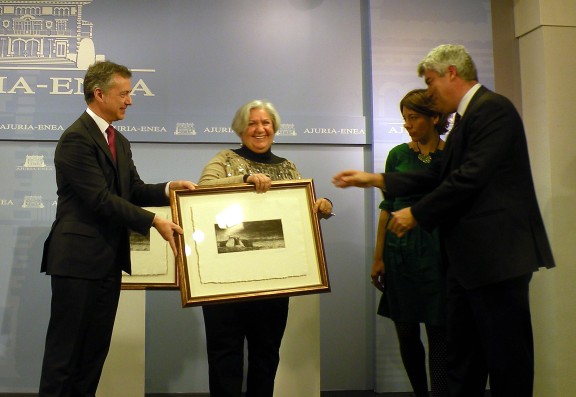 La Red Vasca de Apoyo a la Unión Nacional de Mujeres Saharauis (UNMS) ha recibido esta semana el Premio Ignacio Ellacuria 2012, de manos del Lehendakari, Iñigo Urkullu. Es un premio concedido por el Gobierno Vasco en reconocimiento al trabajo en el ámbito de la cooperación y la solidaridad internacional. El premio lo recogió entre otras la ermuarra María Rosario Arrizabalaga integrante de UNMS. Este galardón, concedido ex aequo (lo ha recibido también Begoña Etayo, funcionaria del Ayuntamiento de Vitoria-Gasteiz y feminista activa), destaca la apuesta de la Red por el trabajo colectivo, aglutinando a organizaciones de solidaridad con el Pueblo Saharaui, organizaciones feministas, áreas de igualdad y cooperación de varios ayuntamientos como el de Ermua y entidades como Eudel, Euskal Fondoa y Emakunde./ Saharar Emakumeen Nazio Batasunari (SENBri) laguntzeko Euskal sareak Ignacio Ellacuría 2012 saria jaso du Iñigo Urkullu lehendakariaren eskutik aste honetan bertan. Saria Eusko Jaurlaritzak ematen du elkartasuna eta kooperazio eremuetan egiten den nazioarteko lana aintzat hartzeko. Saria jasotzen beste hainbatekin batera Maria Rosario Arrizabalaga ermuarra eta egon zen SENBeko taldekidea izan zen. Euskal Sareak talde lanean egiten duen ahalegina azpimarratu du sariak, Saharar herriaren aldeko elkartasun erakundeak, talde feministak eta Ermua herrian ditugun berdintasun eta kooperazio alorrak, Eudel, Euskal Fondoa eta Emakunde bezalakoak biltzen baititu barne. Saria ex equo eman da eta Begoña Etayo Gasteizko udaleko langile eta feminista aktiboari ere egokituz.