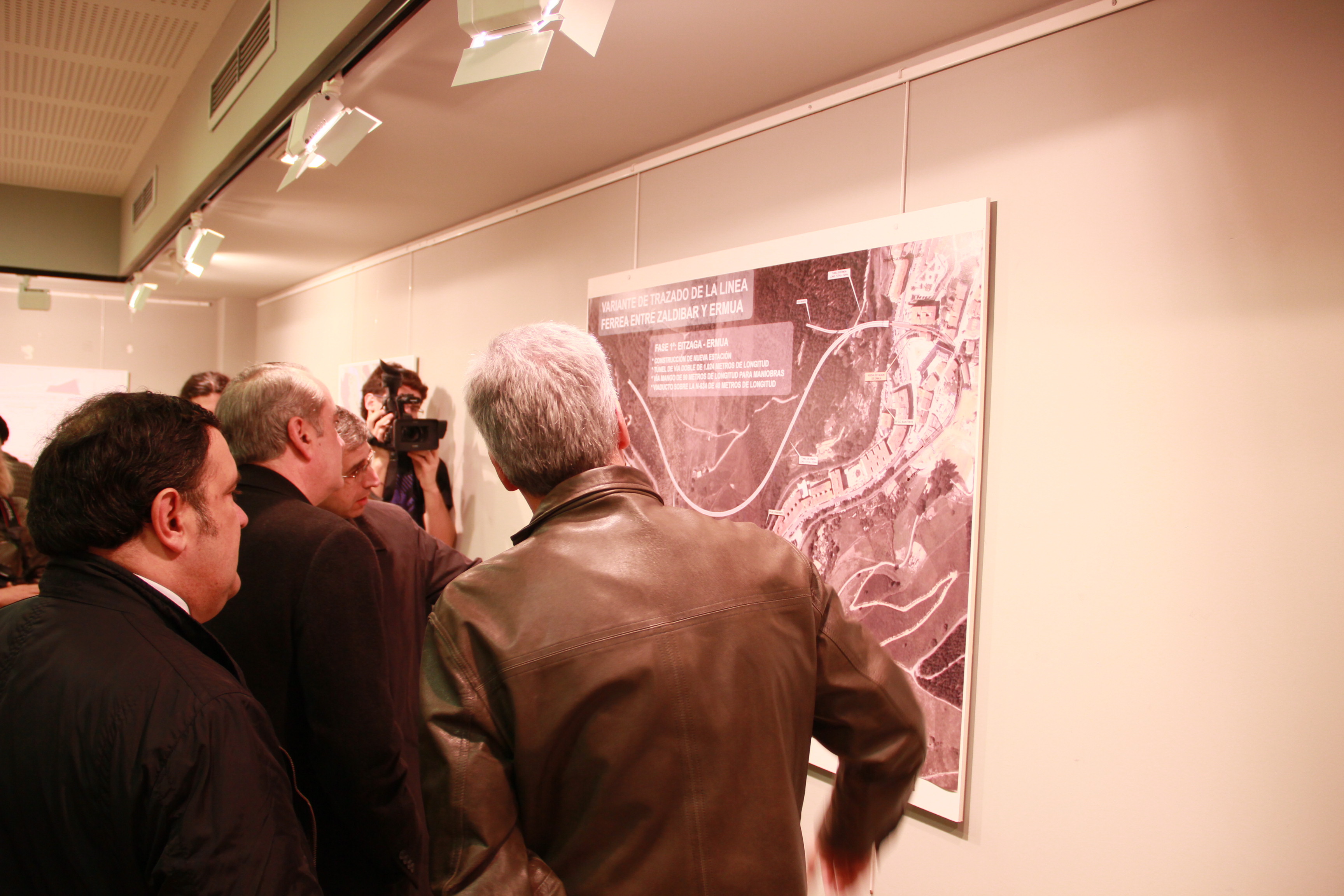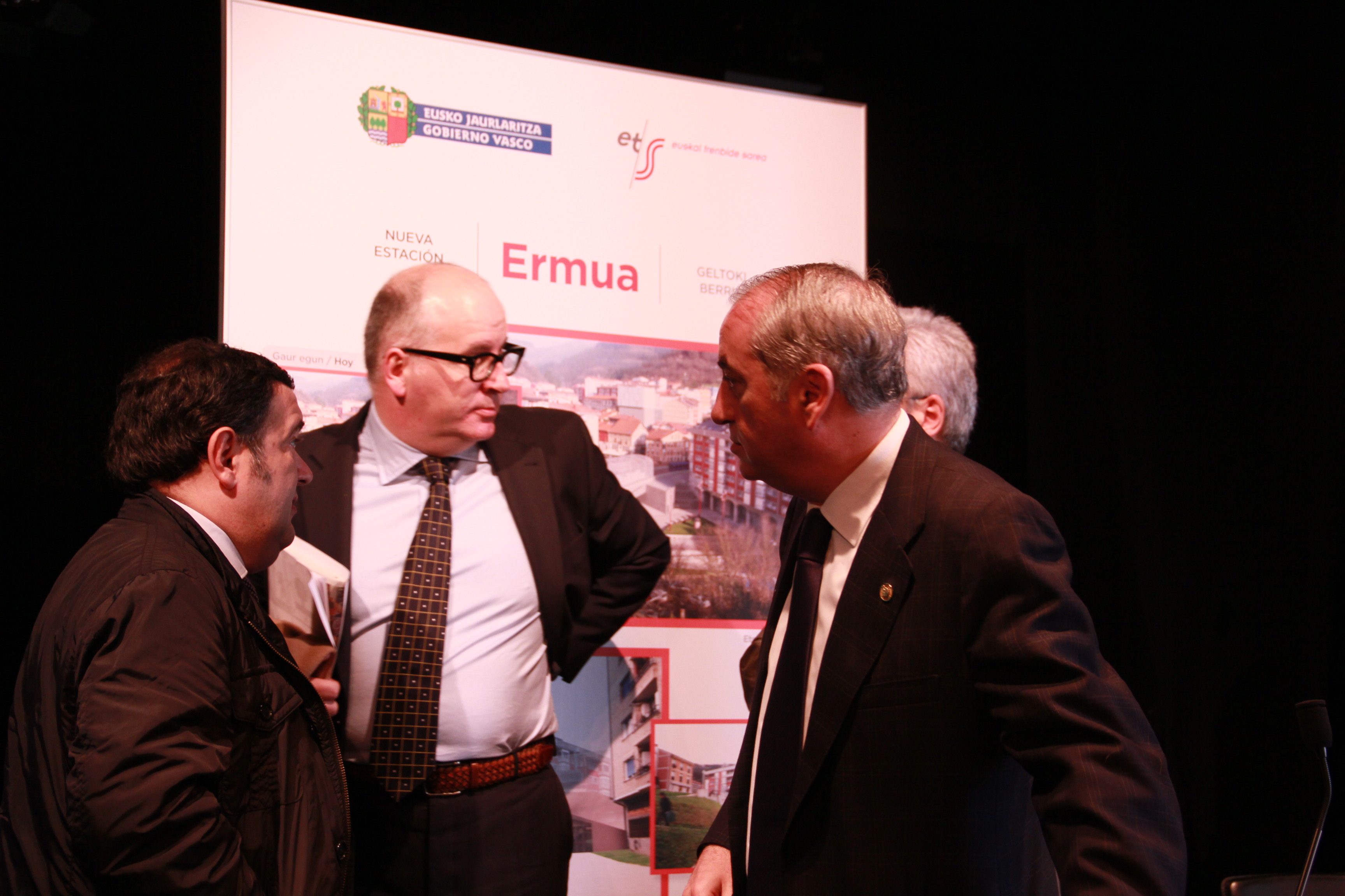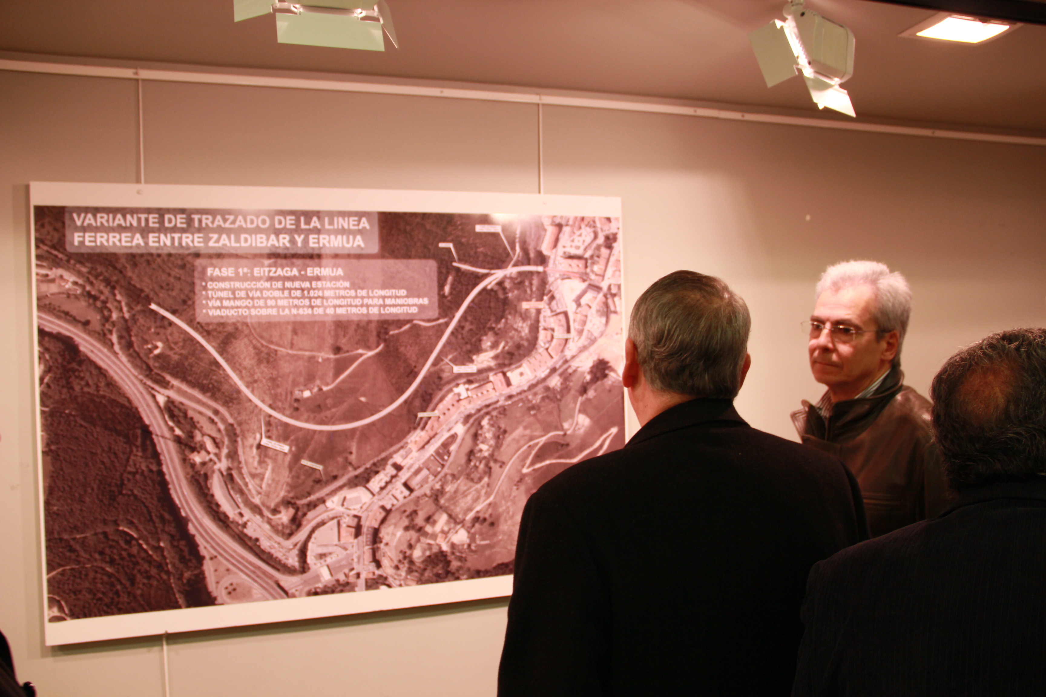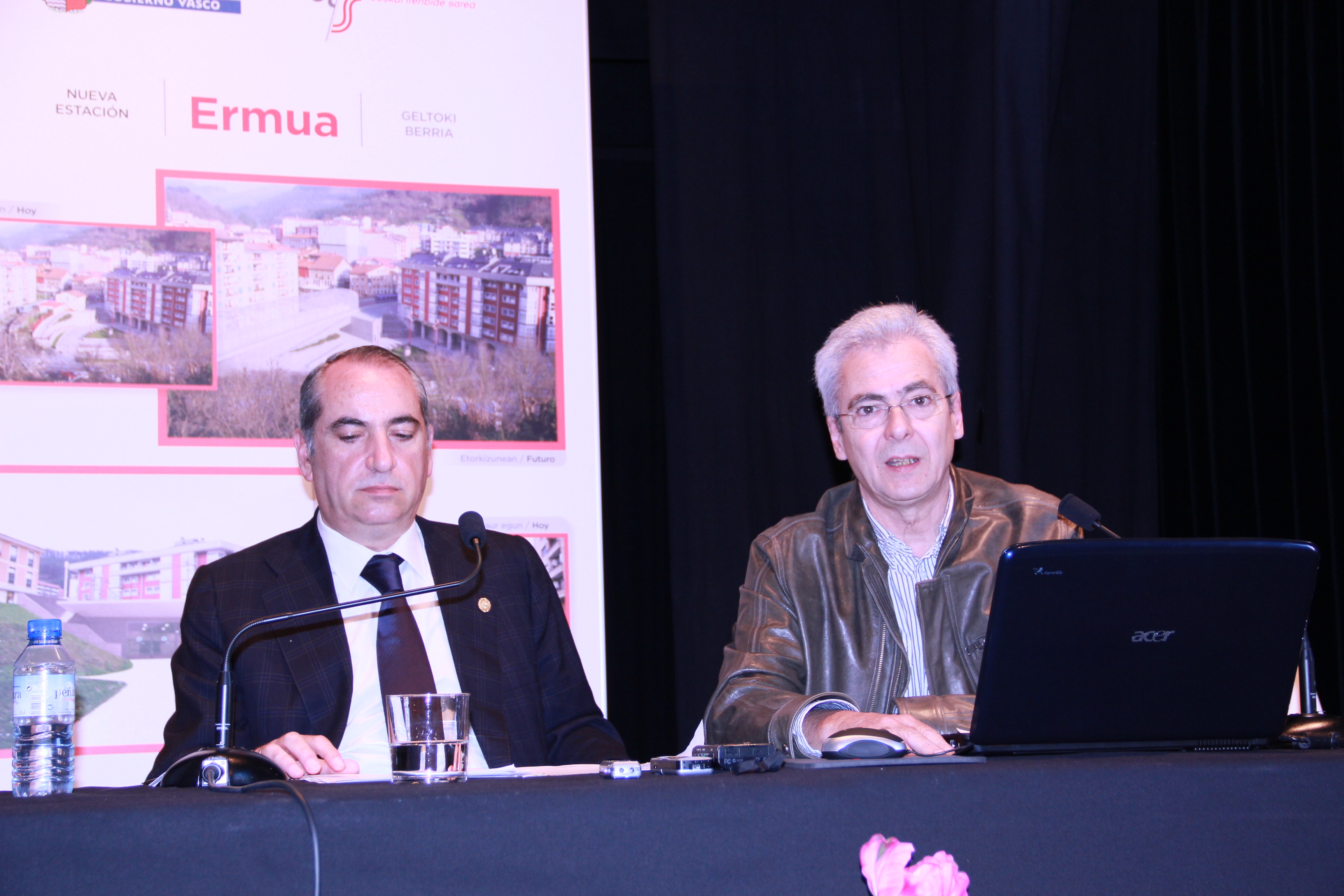 Presentación en Lobiano Kultur Gunea del proyecto de la nueva estación de tren de Ermua por parte del Consejero de vivienda, obras públicas y transportes Iñaki Arriola y el alcalde de Ermua Carlos Totorika