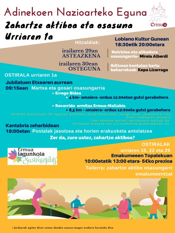Este próximo viernes -día 1 de octubre- es el Día Internacional de las Personas Mayores, jornada impulsada por la Organización de las Naciones Unidas (ONU) que se viene celebrando desde 1991. Para conmemorar la fecha y en el marco del proyecto “Ermua, ciudad amigable con las personas mayores” y de su grupo propulsor, nuestro ayuntamiento ha organizado actividades varias destinadas al colectivo en particular y a la sociedad en general, bajo el título ‘Envejecimiento activo y salud’.