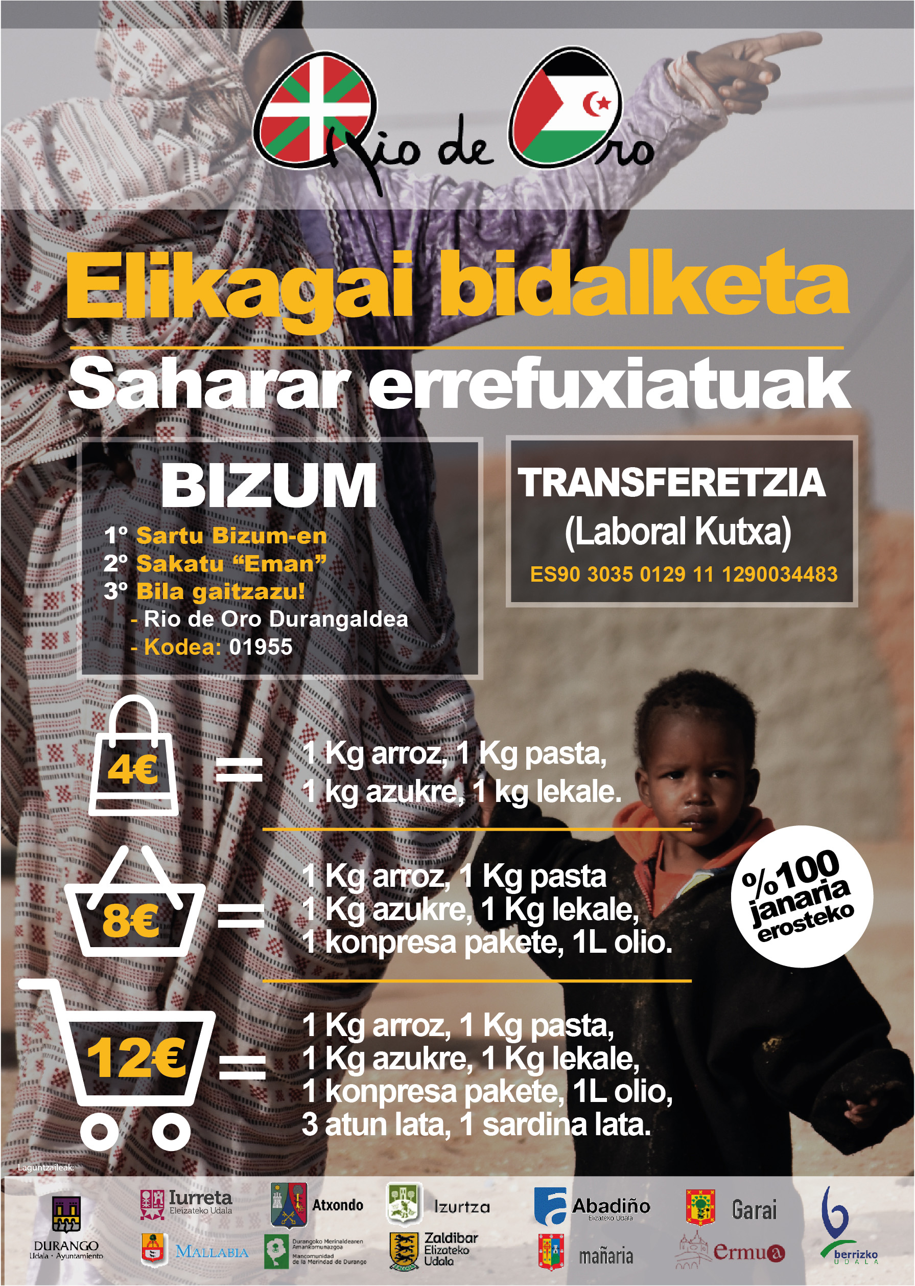 Rio de Oro Gobernuz Kanpoko Erakundeak elikagaak erosteko diru bilketa kanpaina antolatu du Durangaldean beste urte batez, saharar errefuxiatuei babesa emateko, eta Ermuko Udalak bat egin du egitasmoarekin. 2022ko Karabana Solidarioak pandemiaren bigarren urtean iazko formatu berdina izango du, eta dendetan elikagaiak eskura jaso ordez diru bilketa egingo Bizum edo transferentzia bidez. Antolatzaileek 24 tona elikagai biltzea eta Saharako errefuxiatuen eremuetara bidaltzeko helburua du.