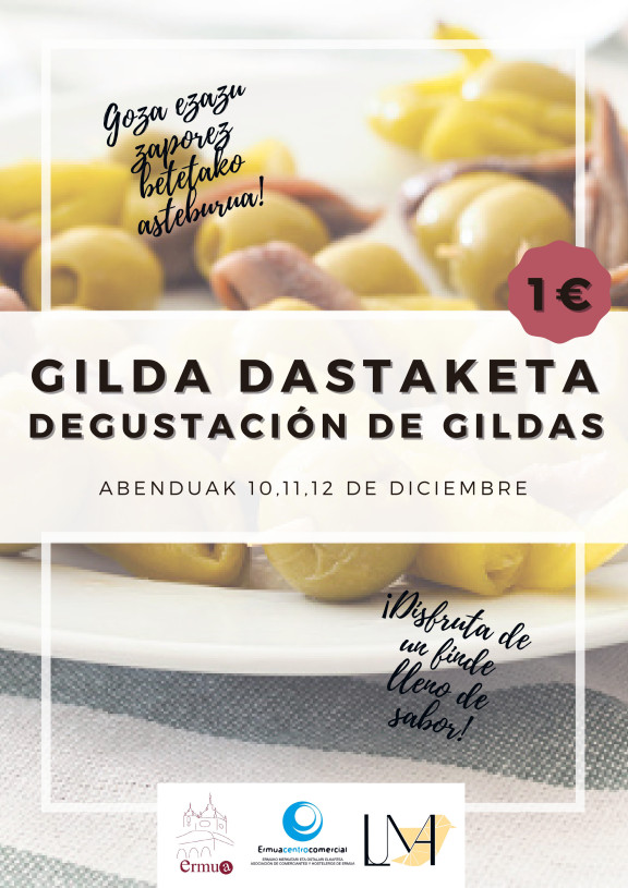 Del 10 al 12 de diciembre la hostelería de Ermua ofrecerá un bocado o pintxo a los/as clientes/as junto con la consumición. La acción será temática y el acompañamiento será la ‘gilda’ en su más amplio sentido y en todas las variantes, que deberemos abonar al precio de 1 €uro.