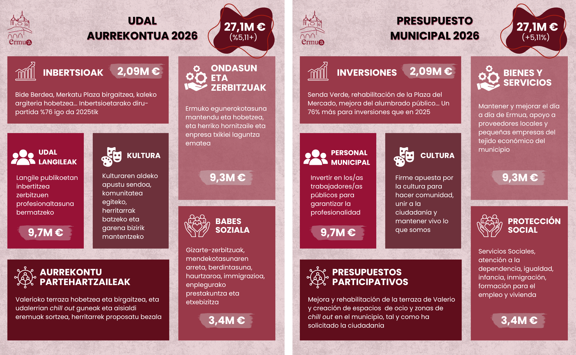 La propuesta de Presupuesto municipal de Ermua para 2026 es de 27,1 millones de euros, un 5;11% más que en el año 2025. Es un borrador de presupuesto que apuesta por las inversiones de proyectos transformadores para que nuestra localidad sea más inclusiva, igualitaria y sostenible. En palabras del Gobierno local “no es un presupuesto improvisado; sino el fruto de una gestión responsable, previsora y profundamente comprometida con el bienestar colectivo”. Para el equipo “no son solo cifras, ni cuadros, ni porcentajes. Son el reflejo del compromiso con nuestro municipio y con su gente. Con las personas que cada día hacen de Ermua un lugar más justo, más inclusivo y más dinámico. Detrás de cada euro presupuestado está el propósito de "mejorar la vida de nuestras vecinas y vecinos” han subrayado.