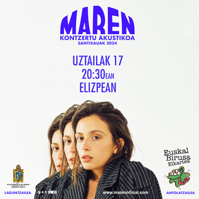 La cantante y compositora ‘Maren’ cantará hoy en Ermua en los pórticos de la iglesia, a partir de las 20.30 horas. Es un concierto acústico en directo en un formato reducido que ha organizado por Euskal Birusa y se incluye en el programa de las fiestas patronales de ‘Santiago’. La entrada es libre y gratuita.