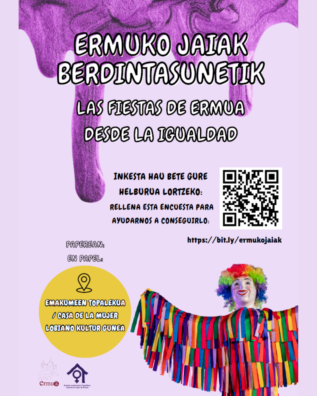 El objetivo de esta encuesta es analizar la presencia de la perspectiva de género en la organización y participación de las fiestas municipales de Ermua desde una perspectiva interseccional en ámbitos festivos como la organización previa, la comunicación, el programa y las campañas contra la violencia machista. La opinión ciudadana es fundamental para identificar fortalezas y áreas de mejora en la organización de las fiestas, para garantizar un entorno más inclusivo para todas las personas. La encuesta es anónima y los datos se utilizarán exclusivamente para análisis y mejora.