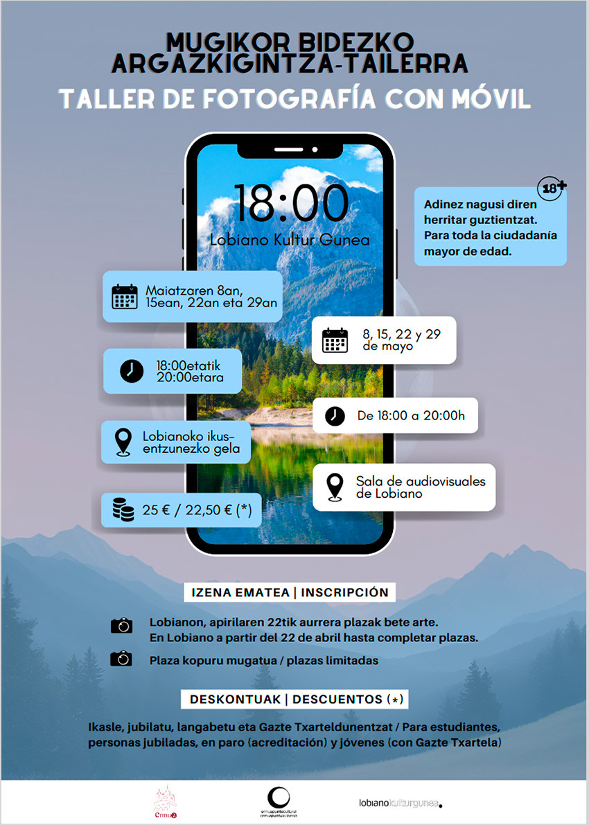 El Departamento de Cultura del Ayuntamiento de Ermua ha organizado un nuevo curso para la ciudadanía que se realizará en Lobiano Kultur Gunea en el mes de mayo próximo. El curso será un taller de fotografía con móvil para personas mayores de edad y la inscripción general costará 25€, en tanto que las personas estudiantes, jubiladas, en situación de desempleo o con Gazte txartela tendrán bonificación y abonarán 22,5€uros. El taller se impartirá en la sala de Audiovisuales de Lobiano Kulturgunea los jueves 8, 15, 22 y 29 de mayo.