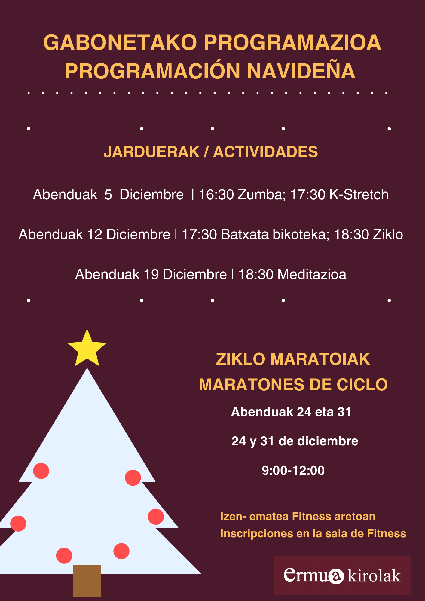 Ermua Kirolak ha organizado para este mes de diciembre una programación de actividades especiales con motivo de la Navidad. Las personas abonadas al polideportivo tendrán actividades gratuitas los tres próximo viernes y dos maratones deportivos de ciclo indoor en las mañanas de Nochebuena y de Nochevieja. Las personas interesadas deben inscribirse en la sala de fitness de la primera planta del polideportivo M.A. Blanco. El aforo es limitado y las plazas se asignarán por orden de inscripción.
