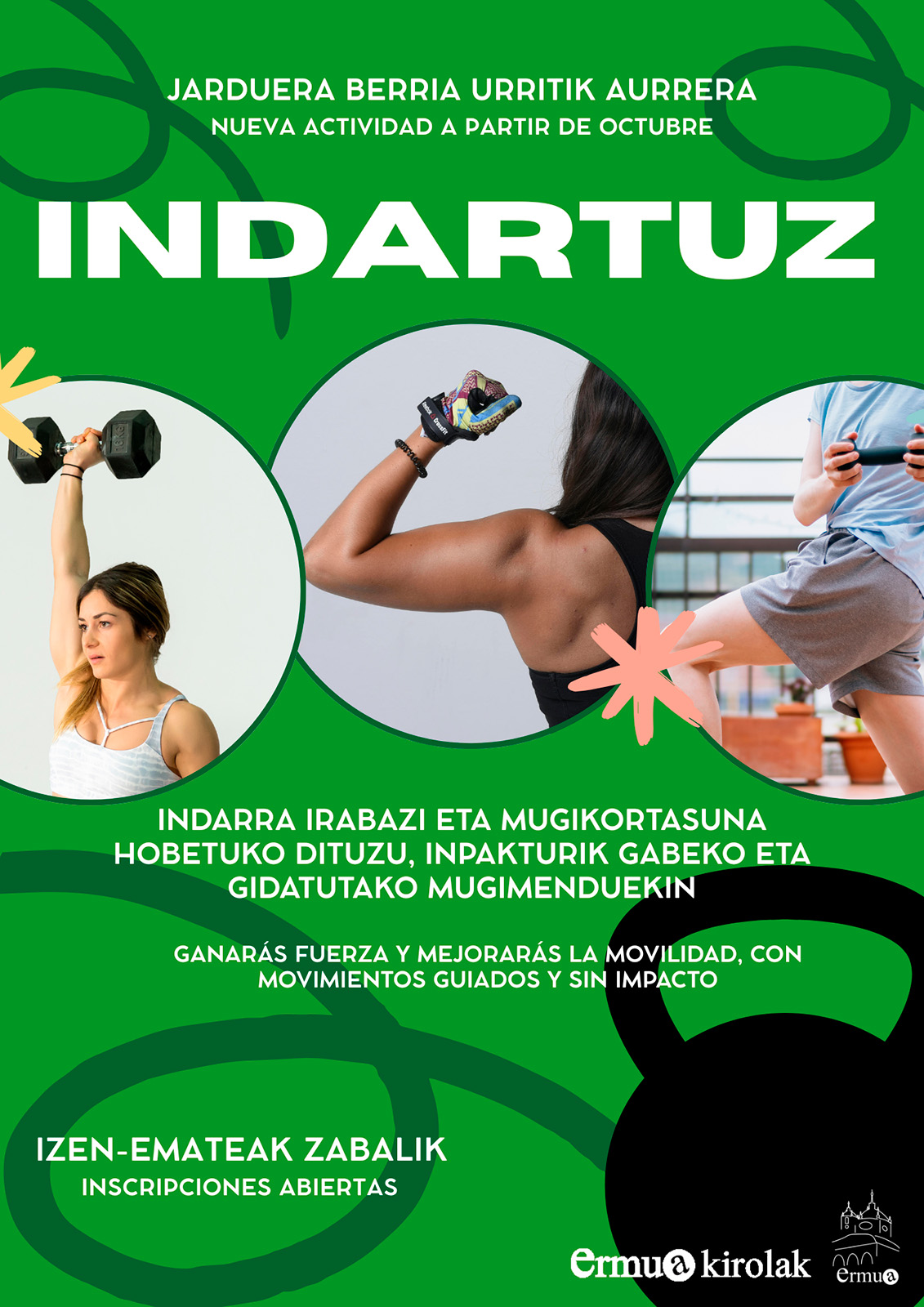‘Indartuz’ es la última en incorporarse; una actividad con monitor/a dirigida a ganar fuerza, a mejorar tu movilidad y a sentirte mejor en tu día a día, que evita los ejercicios bruscos o de alto impacto. El curso está enfocado en movimientos controlados, sin impacto, adaptados a todos los niveles. No es necesario tener experiencia previa.