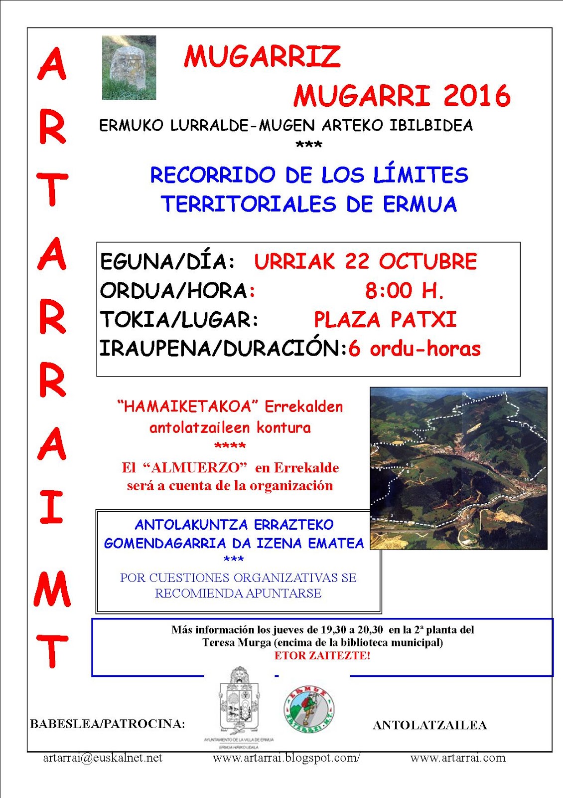 La excursión está bautizada como ‘Mugarriz Mugarri’ en referencia a los “mojones” o piedras que delimitan los límites territoriales. Ermua, con sus 6,49 Km2 es un pueblo pequeño si nos referimos a él hablando únicamente en términos territoriales. Todos los pueblos que nos rodean son considerablemente más grandes que el nuestro.
