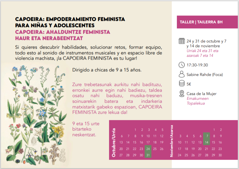Zure trebetasunak aurkitu nahi badituzu, erronkei aurre egin nahi badiezu, taldea osatu nahi baduzu, musika-tresnen soinuarekin batera eta indarkeria matxistarik gabeko espazioan, CAPOEIRA FEMINISTA zure lekua da!