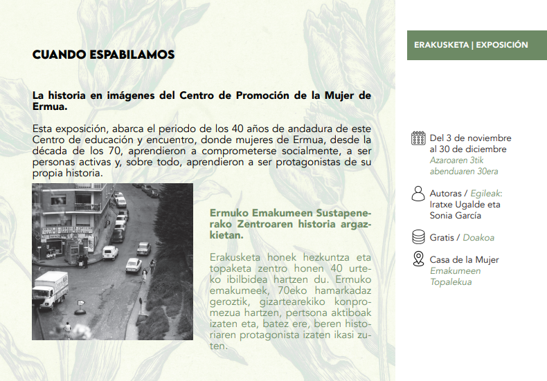 Ermuko Emakumeen Sustapenerako Zentroaren historia argazkietan. Erakusketa honek hezkuntza eta topaketa zentro honen 40 urteko ibilbidea hartzen du. Ermuko emakumeek, 70eko hamarkadaz geroztik, gizartearekiko konpromezua hartzen, pertsona aktiboak izaten eta, batez ere, beren historiaren protagonista izaten ikasi zuten.