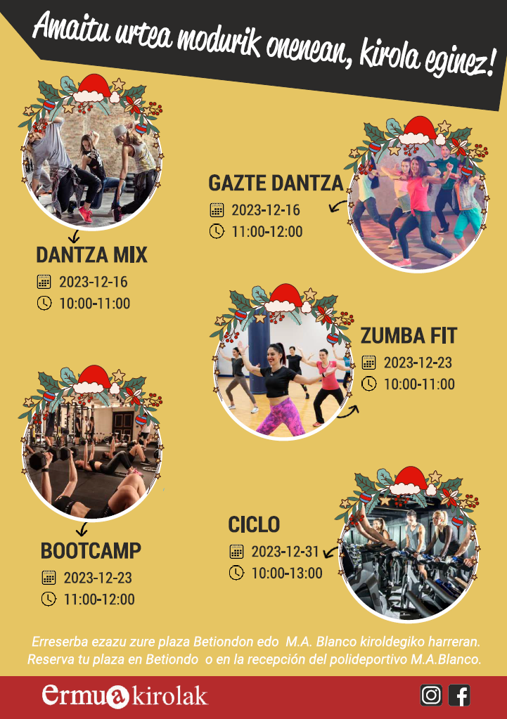 Gabonetako afari eta bazkari oparoen aurretik, abenduaren 23an, larunbata, gorputza musikaren erritmora mugitu ahal izango dugu zumba fit klasearekin (10-11 ordu) edo ariketa fisiko eta kirol bizia egin bootcamp bidez (11-12 ordu).