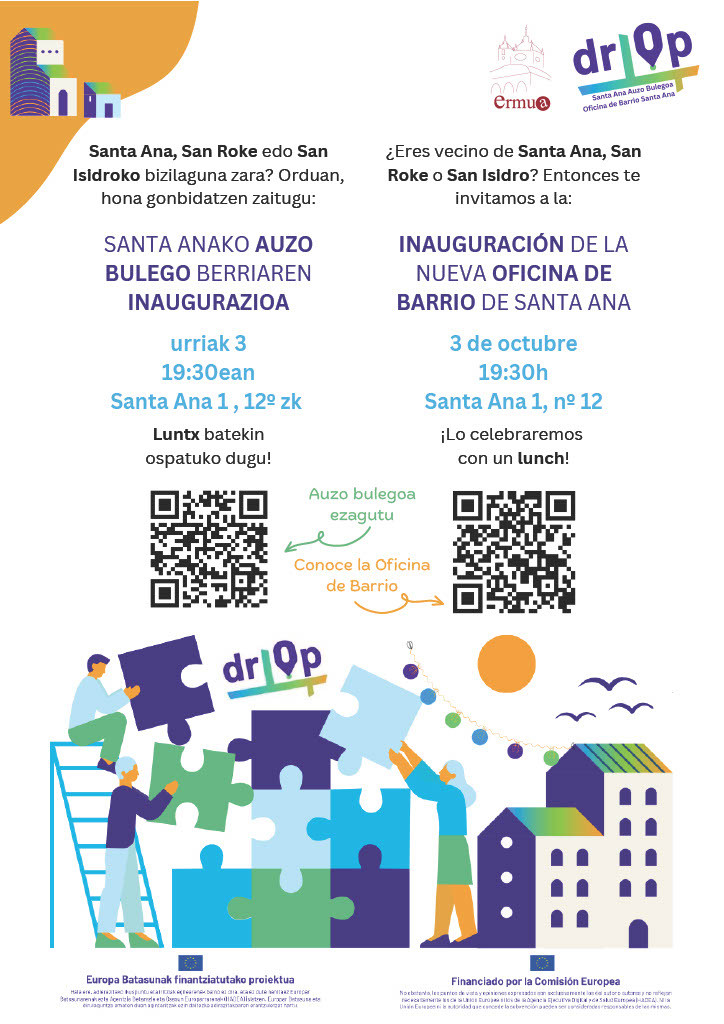 Europako Batzordeak finantzatutako eta Ermuko Udalak koordinatutako drOp proiektuaren helburua 60ko eta 80ko hamarkaden artean eraikitako auzoak eraldatzea eta auzo moderno eta inklusibo bihurtzea da, hiri-espazioa eta herritarren bizi-kalitatea hobetuz. Santa Ana auzoa proiektu honen aitzindaria da, eta eremu honetan haren garapena sustatzeko ekintzak eta ekimenak egiten ari dira. Ekintza horien artean dago auzoko bulegoa irekitzea, Santa Anako bizilagunekin gizarte eta kultur ekimenetarako topagune gisa balio duena.